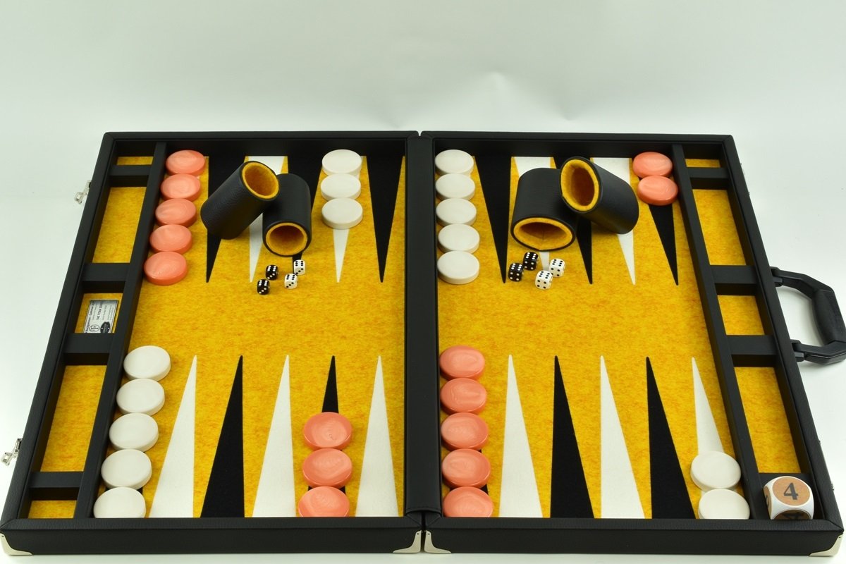 (0 customer review)Titan Series Flecked Saffron, Black - White Backgammon Set. 50mm (2") Orange and White Checkers