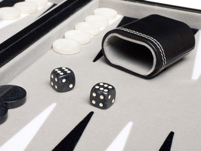 Furthermore, the high-gloss checkers in ghost white and black feature a captivating mother-of-pearl design. The coordinating dice cups are lined with the same velvet as the playing field and accented with double stitching for a cohesive look.