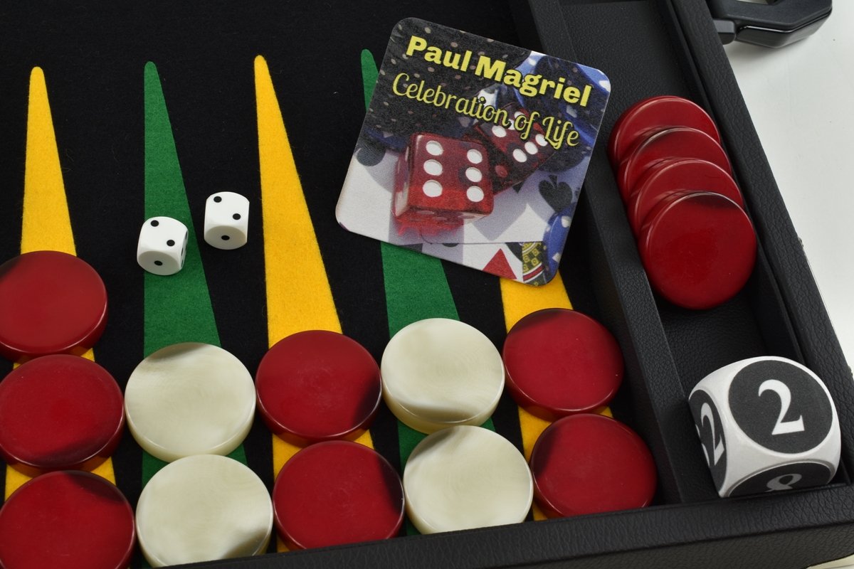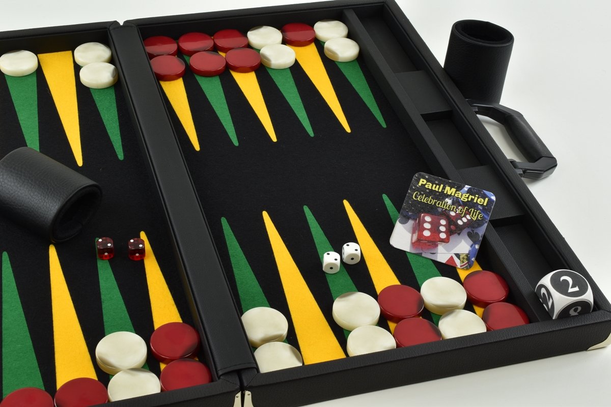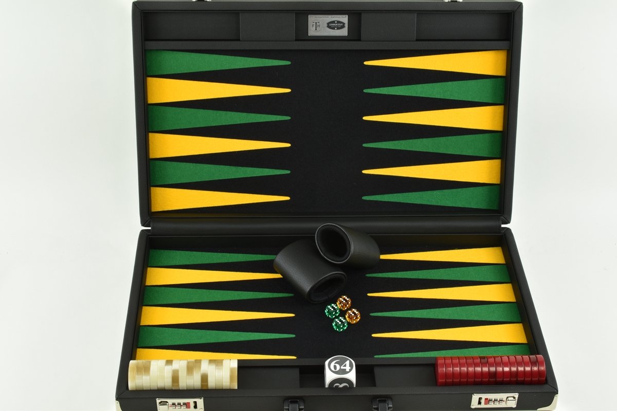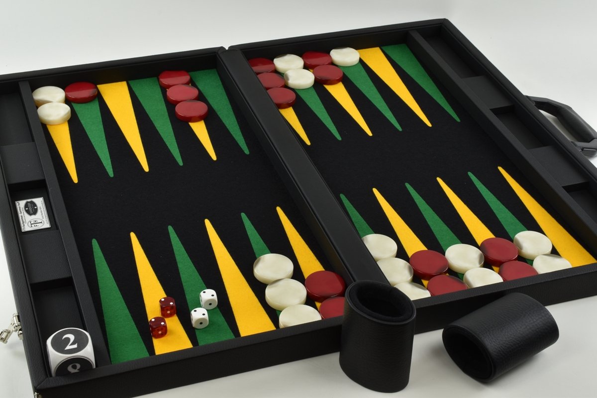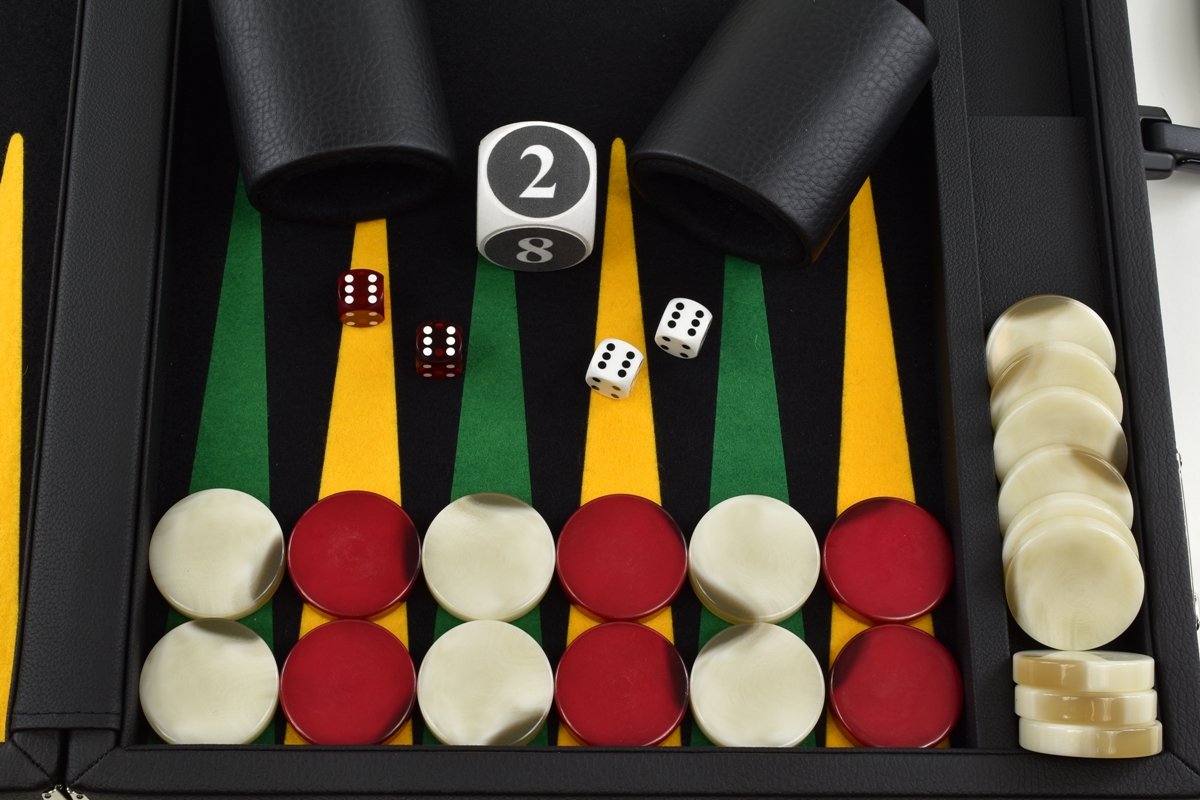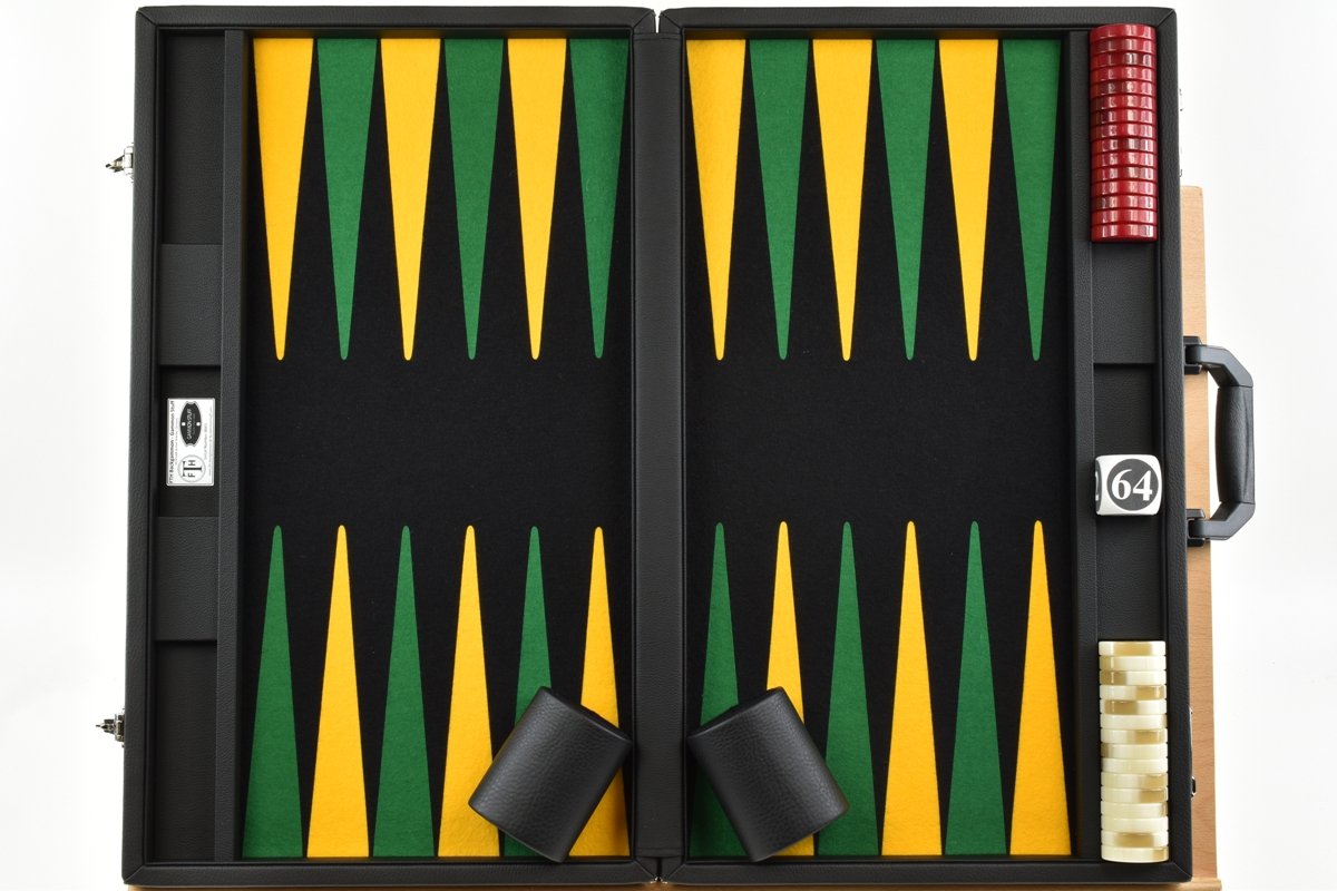 • Black/ Green – Yellow FTH Tournament Size Backgammon Board. 45mm Red & White Checkers