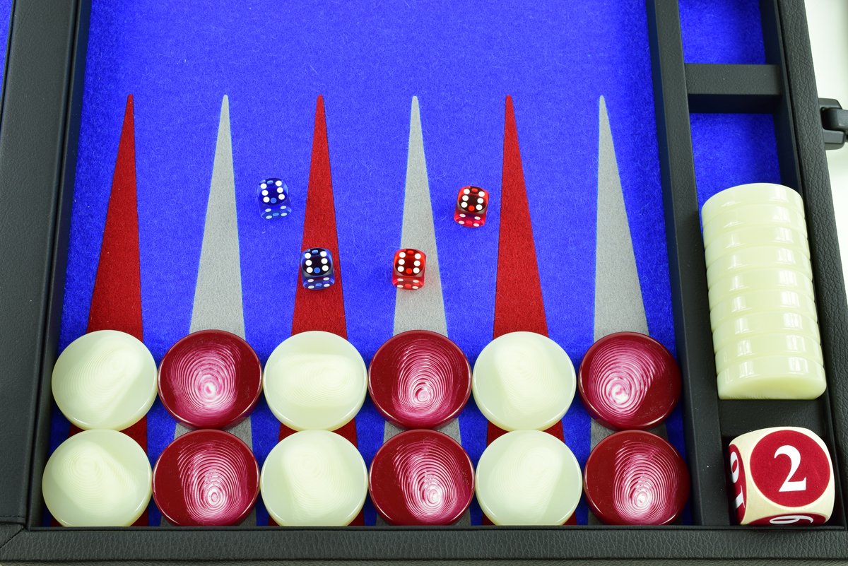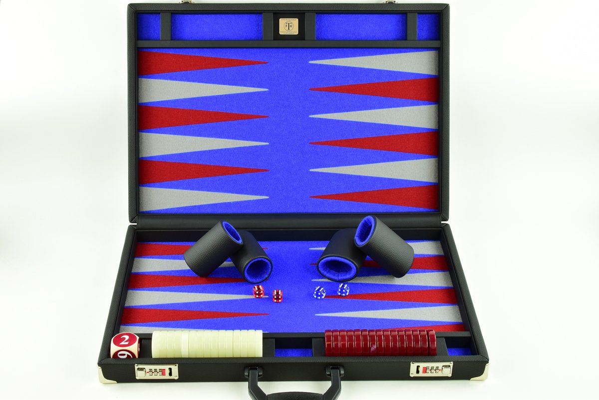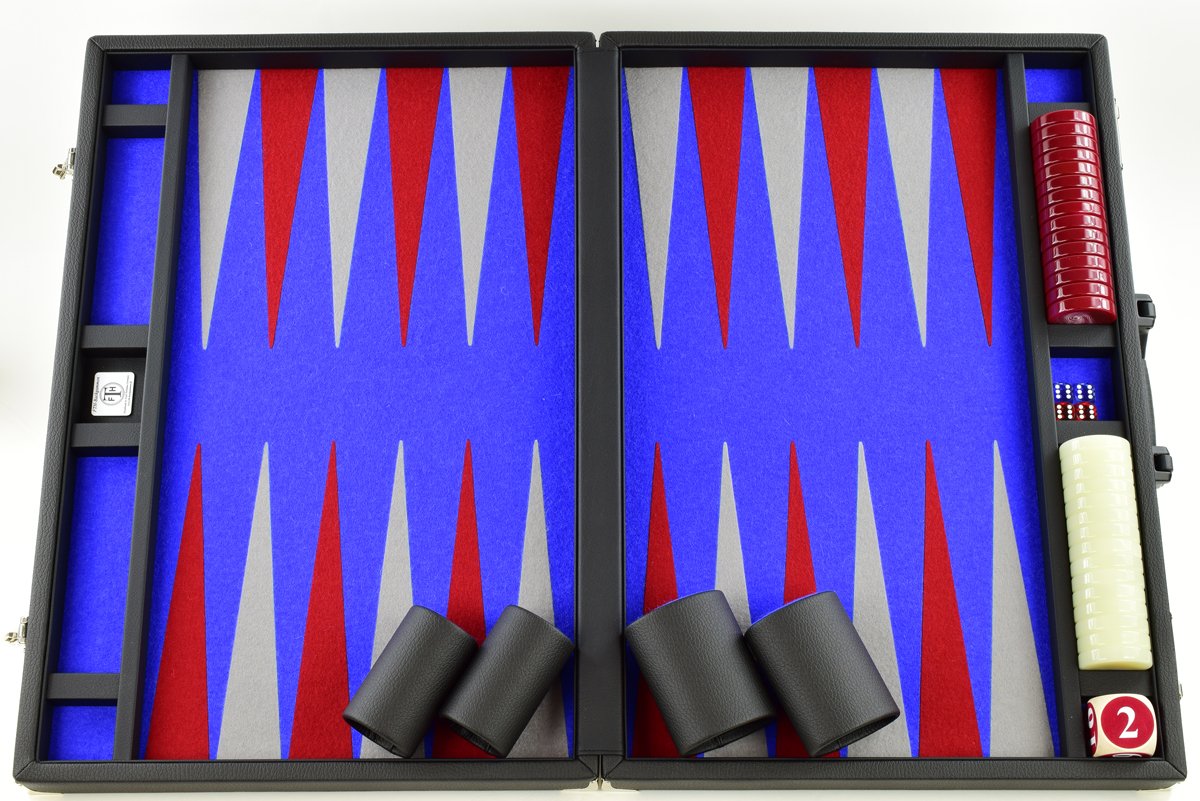 • Blue-Red-Gray Jumbo FTH Backgammon Set. Red & White 50mm Checkers