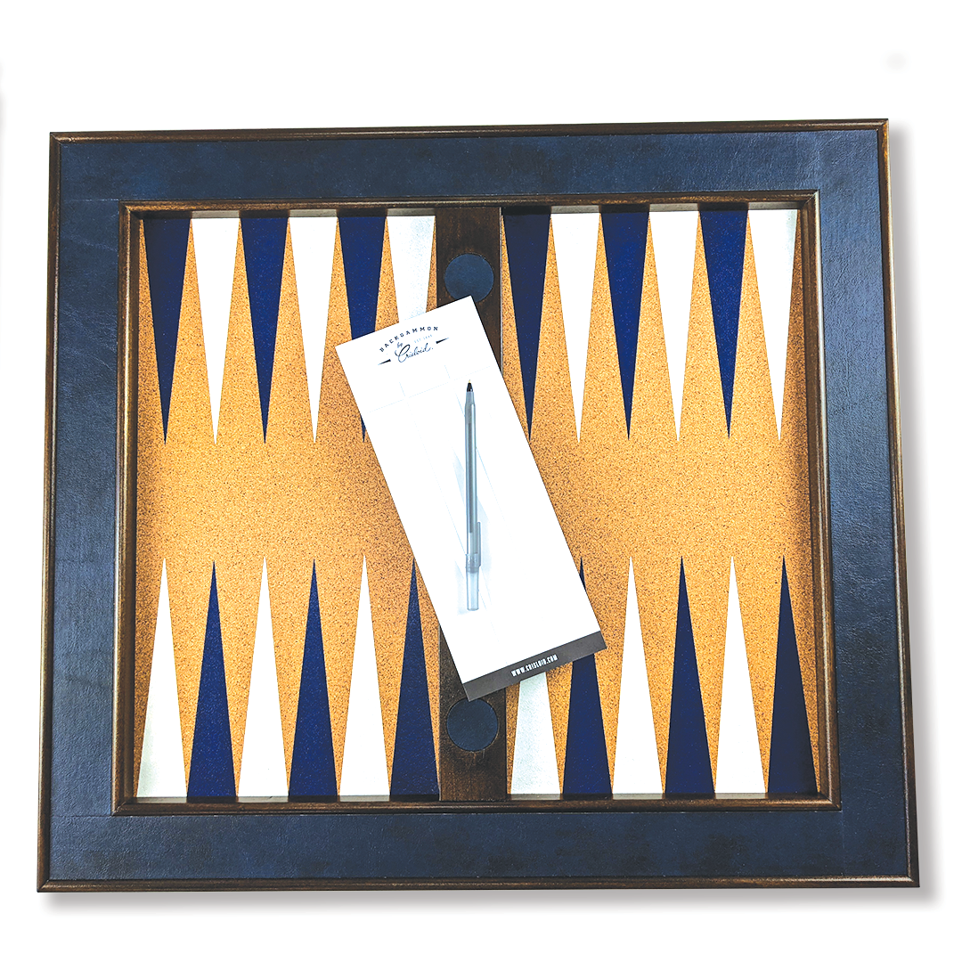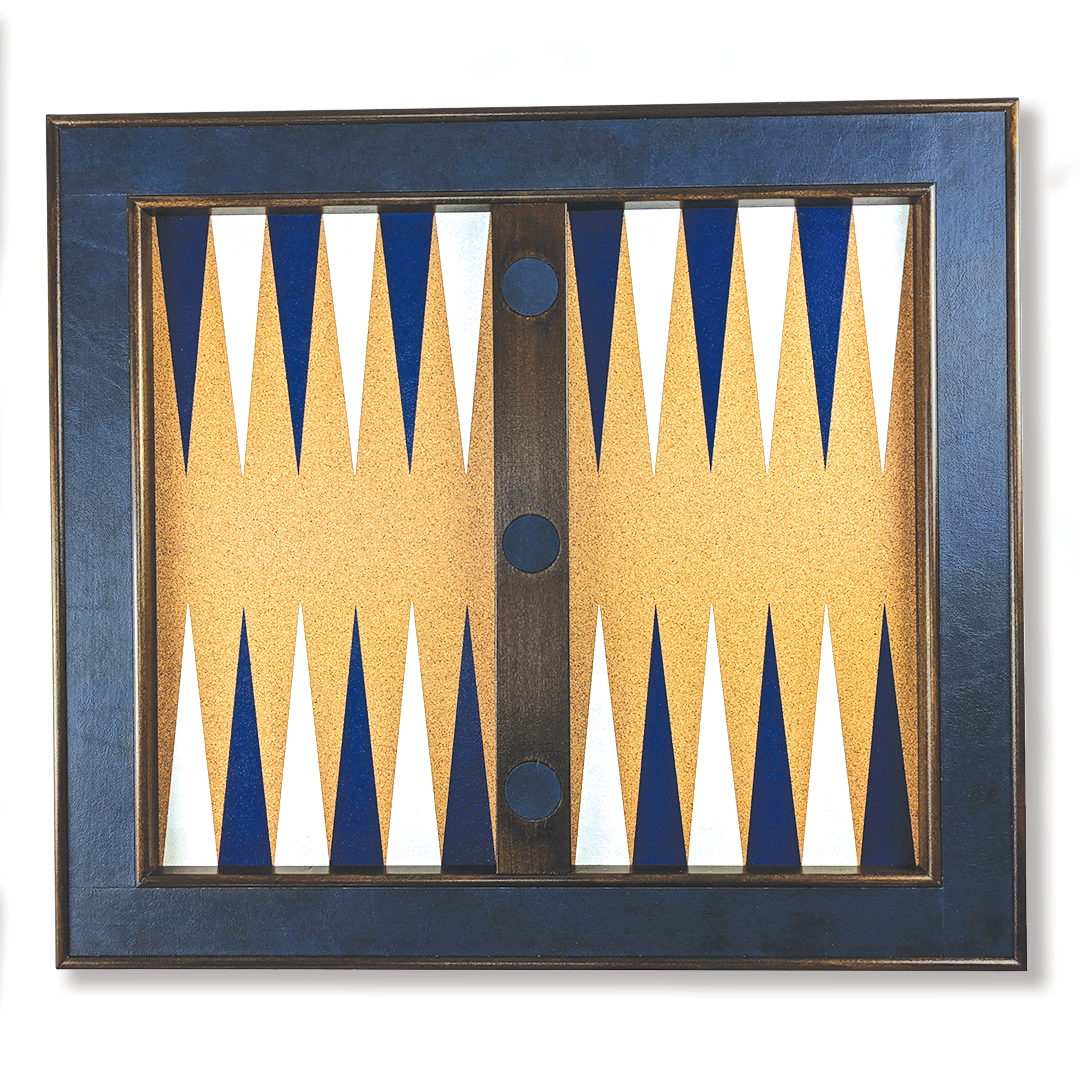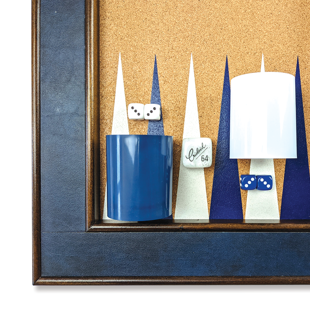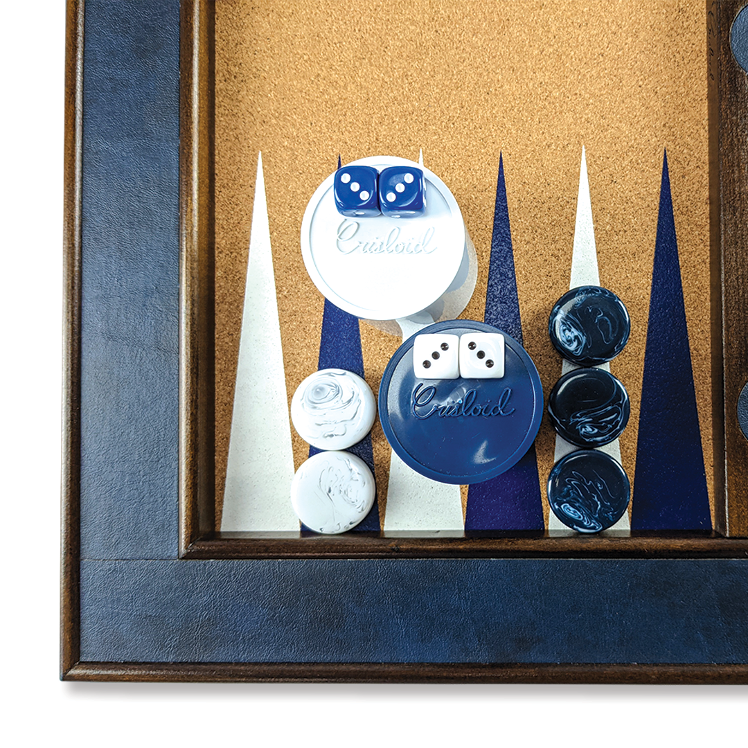 Constructed with fine cork, the playing surface ensures smooth gameplay, especially when paired with our meticulously polished checkers. This backgammon set includes all the necessary accessories: two plastic dice cups (one blue, one white), dice, dice roller cups, and our acclaimed backgammon checkers—widely regarded as the best in the industry. Available in blue, brown, and green, Crisloid’s Champion Tabletop backgammon set strikes the perfect balance between solidity and manageability, sophistication and subtlety.