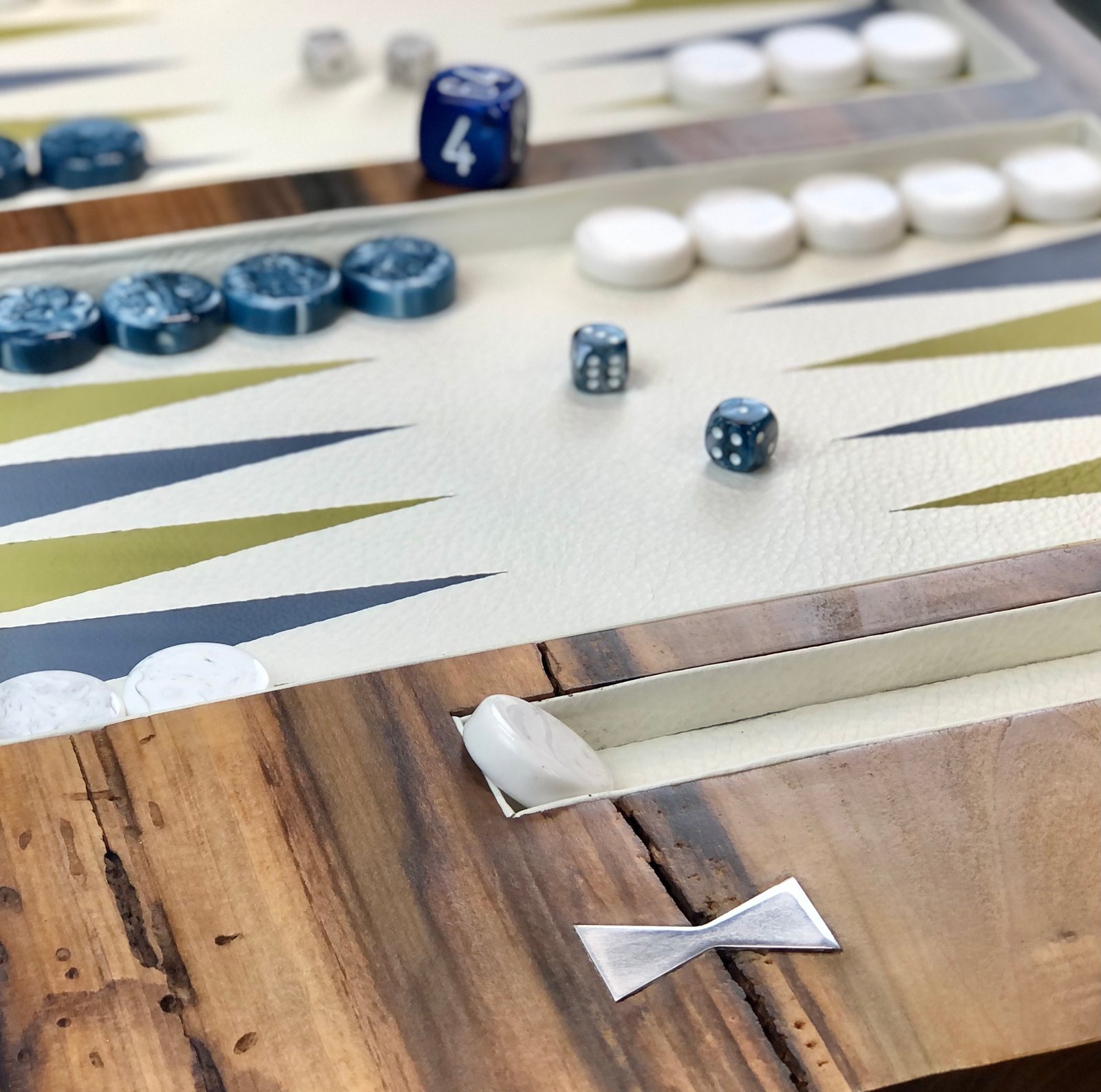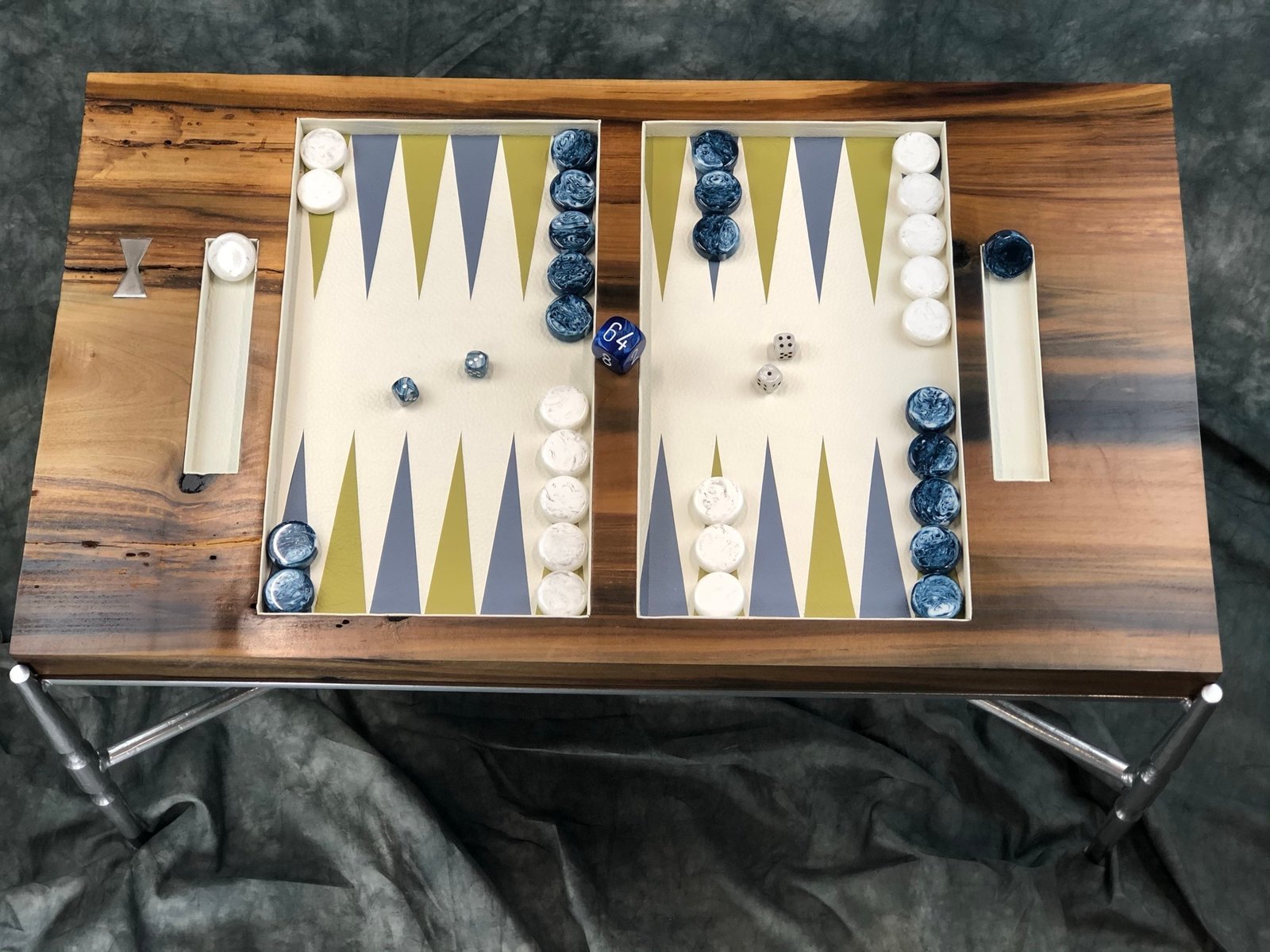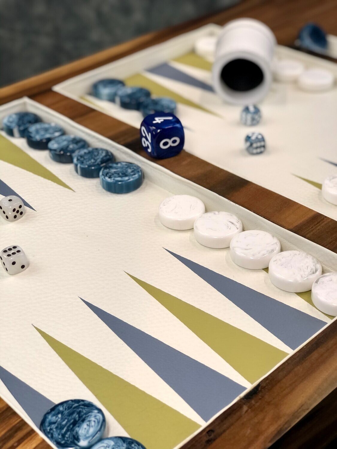 Checkers, dice, leather dice cups and doubling cubes pictured are included with all Legacy Boards orders,