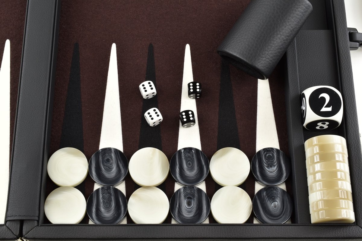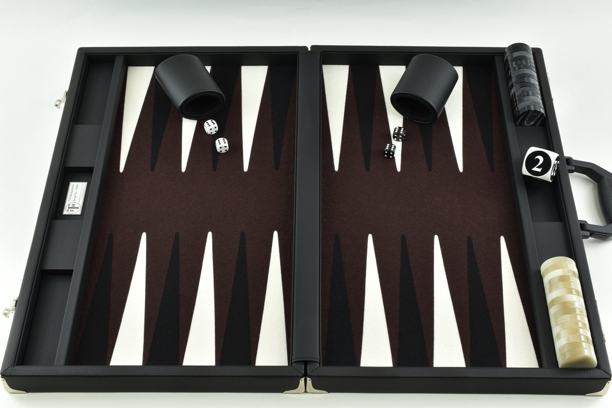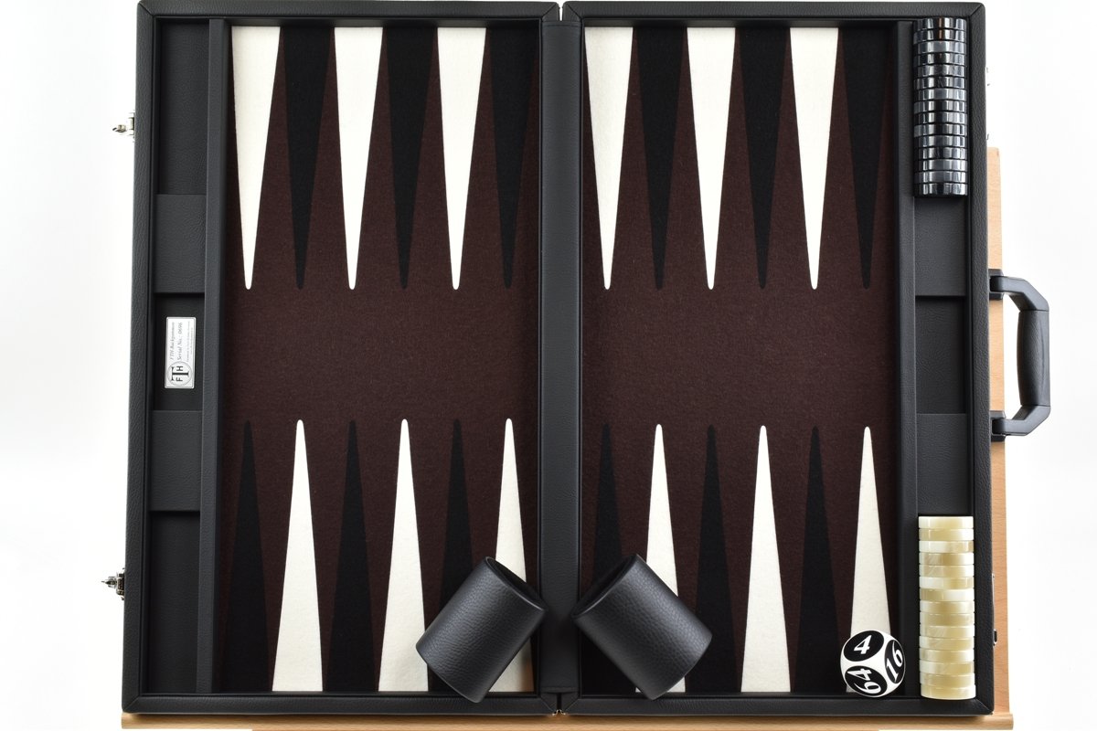 • Dark Brown/White/Black FTH Tournament Size Backgammon Board. 45mm Checkers