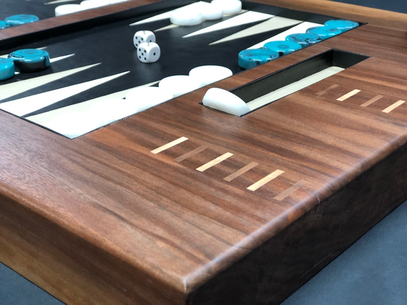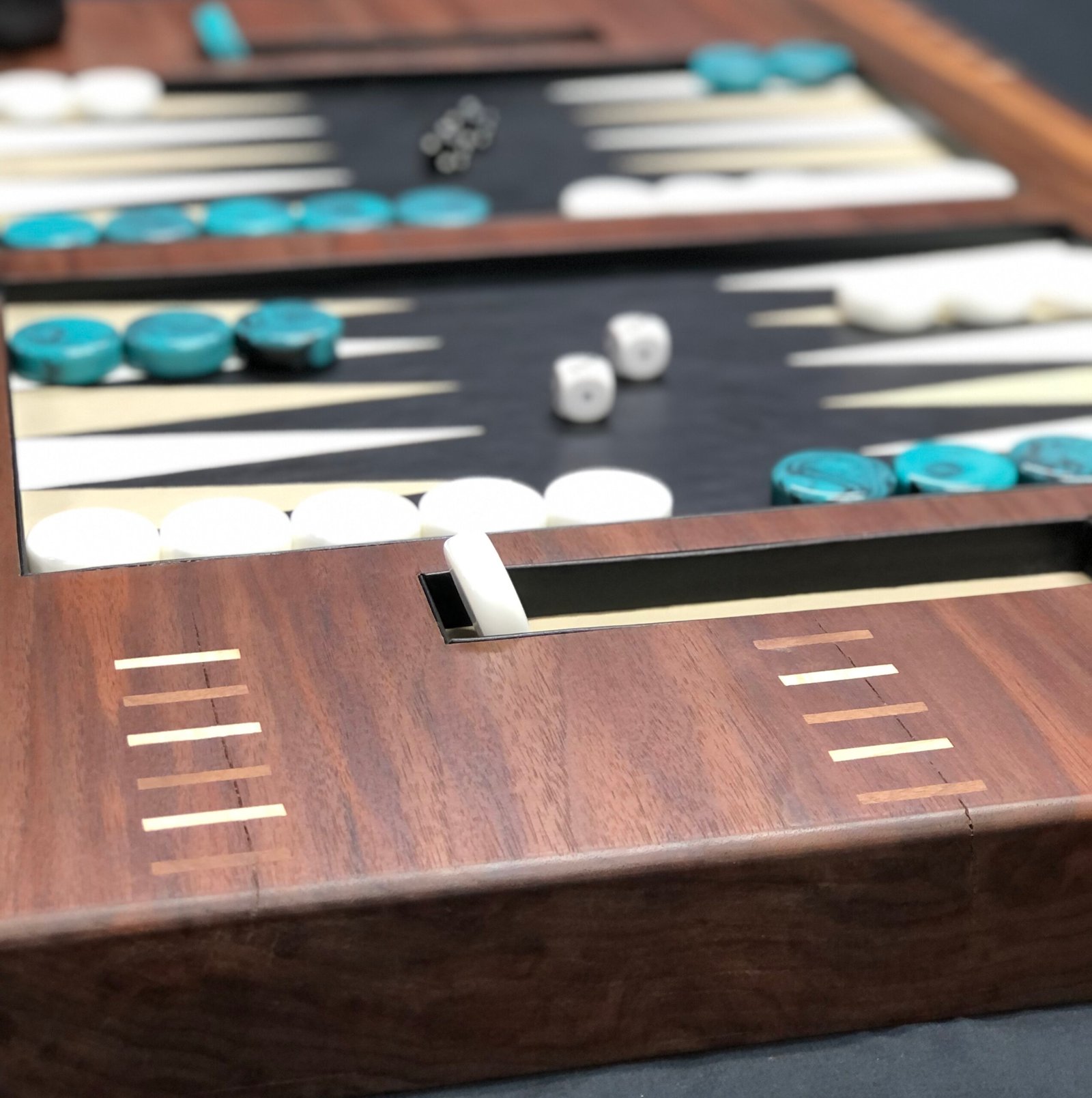 Perfectly sized for a board game, Gramercy is a show-stopper and a perfect addition to a family room, game room, or any space where families gather. As with every piece we create, the checkers, dice, and doubling cube add beautiful color details that provide great depth and beauty to Gramercy.