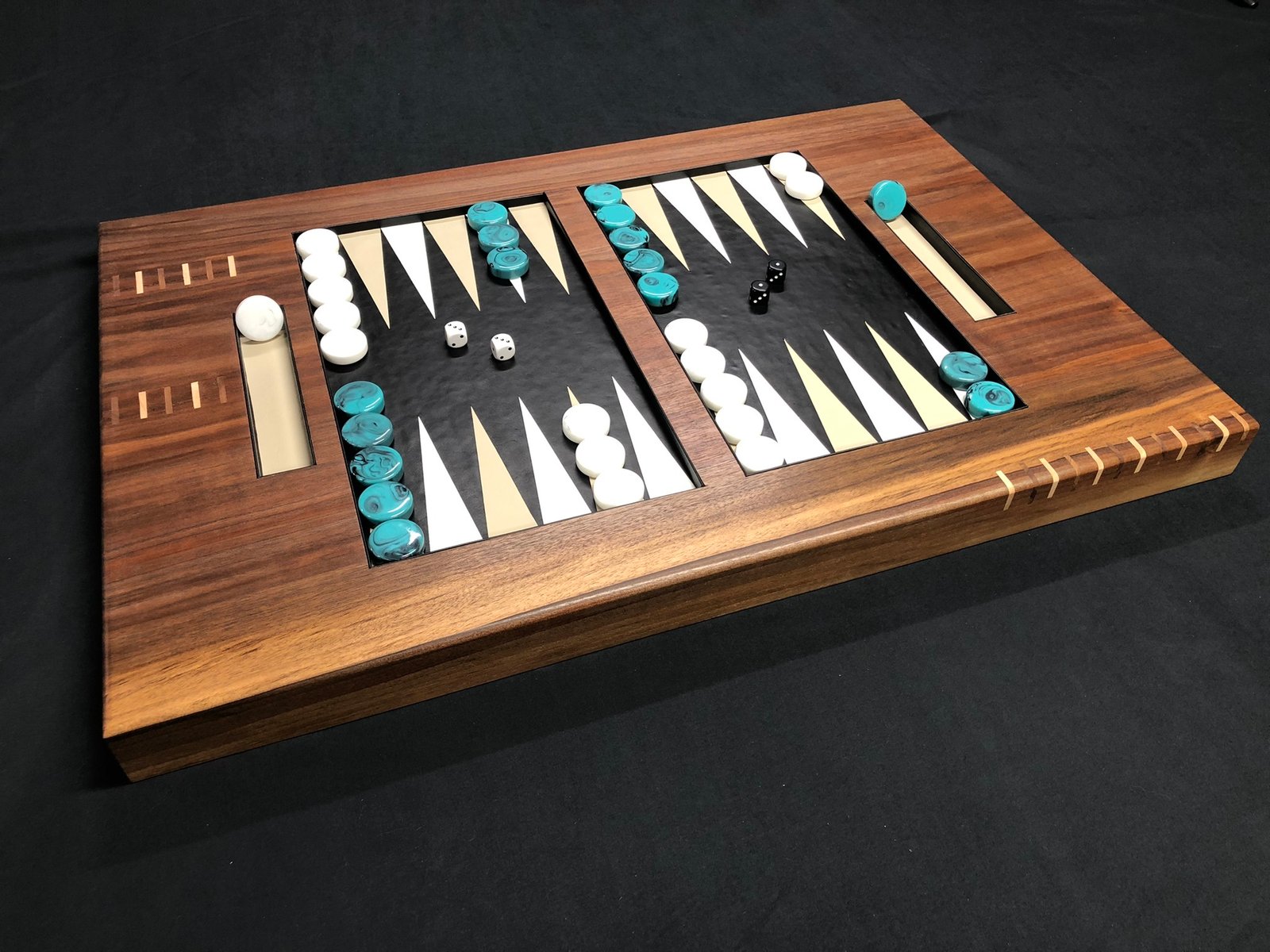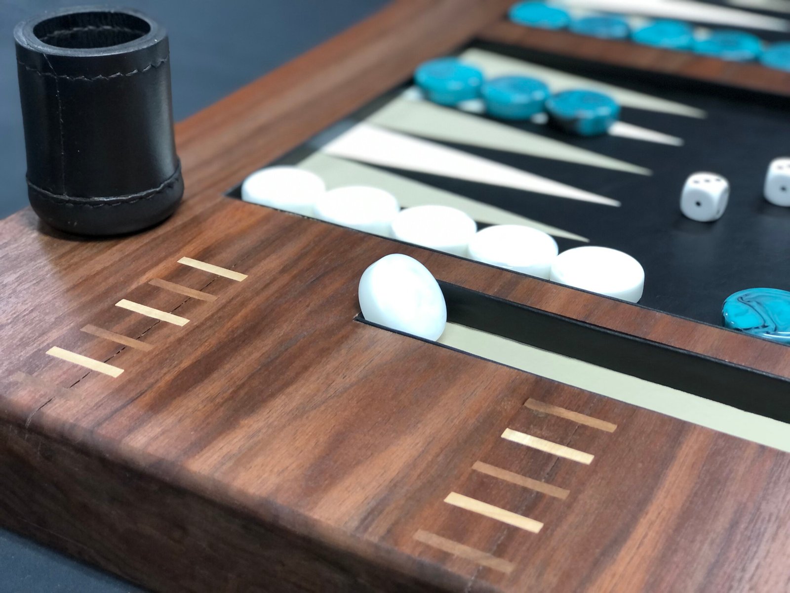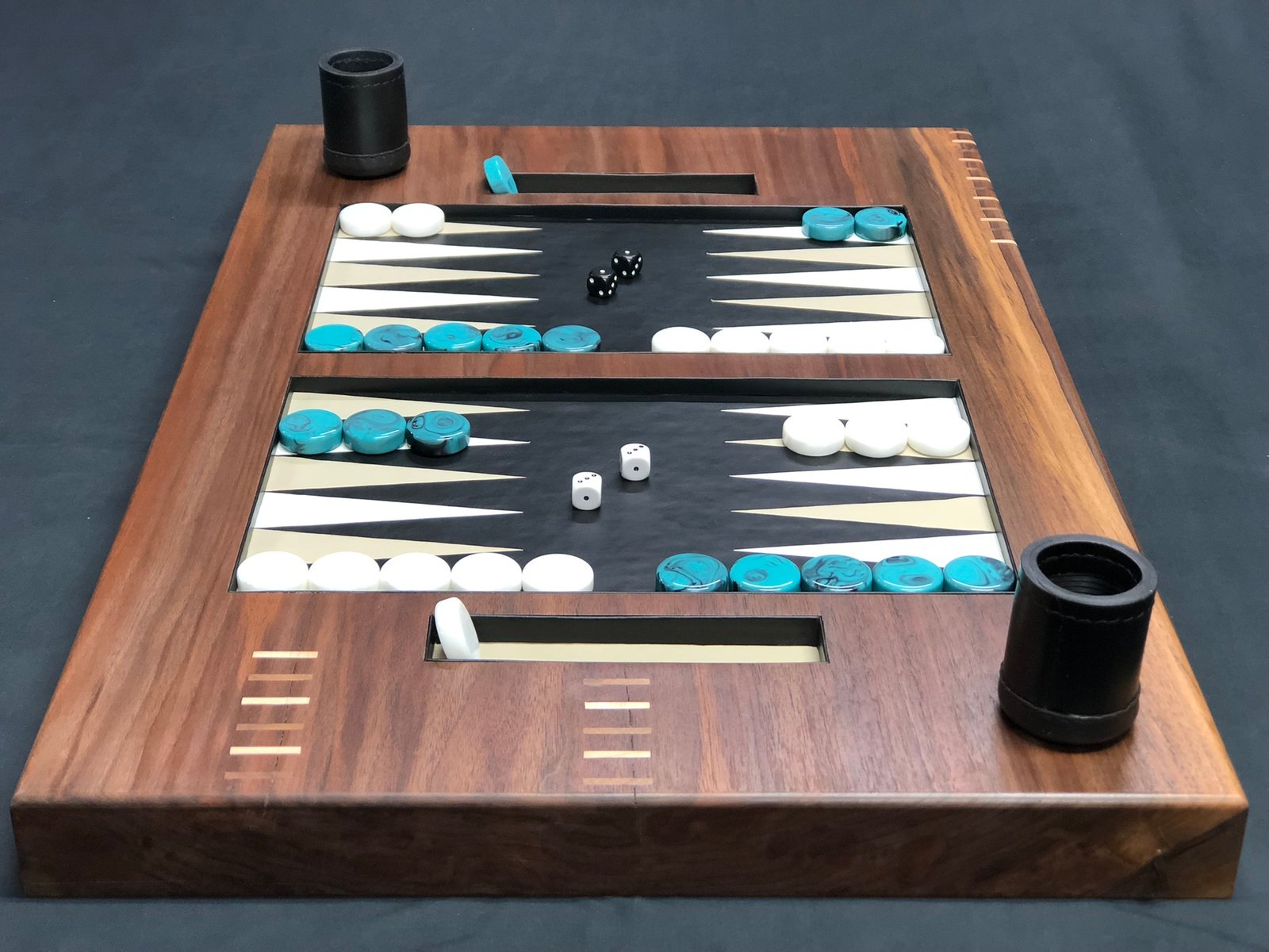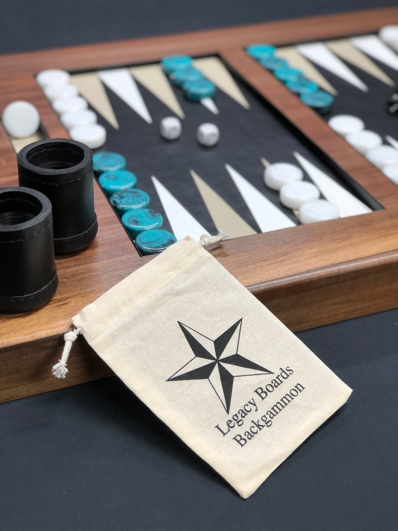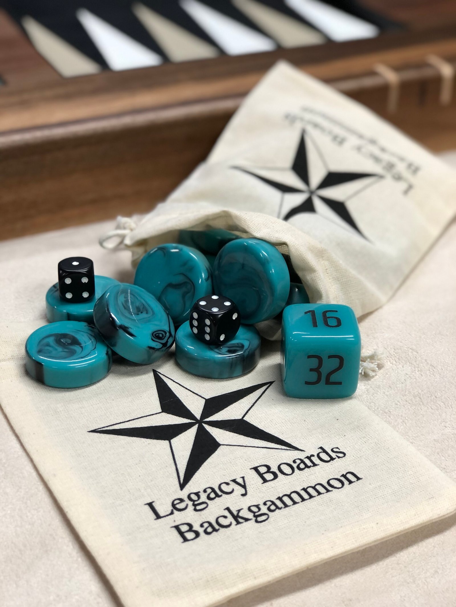 Checkers, dice, leather dice cups and doubling cubes pictured are included with all Legacy Boards orders,