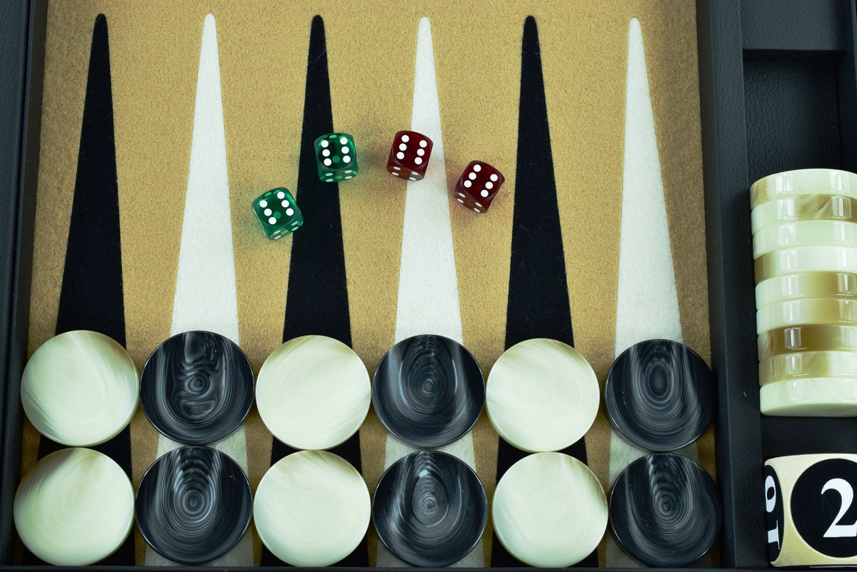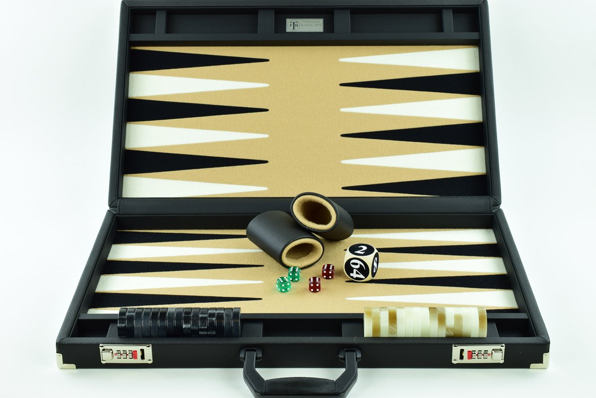 • Sand-Black-White FTH Tournament Size Backgammon Board. 45mm Checkers