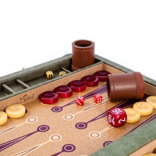 True to tradition, we’ve commenced with our robust hardwood case, enveloped in a durable, premium textile in a stylish Hops colorway. The striking red and gold point design adds a nostalgic touch to the board, exclusive to the Legacy line. Complementing these are the matching gold and burgundy finger-dished checkers, unique to the Legacy series. Accompanying the set are chestnut leather dice cups that snugly fit into the housing. As with all our backgammon boards, the Legacy Backgammon set is proudly crafted in the USA at our Providence, Rhode Island shop. This series also offers Legacy Barley and Legacy Midnight options.