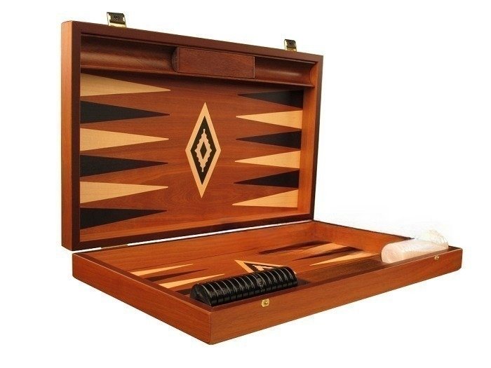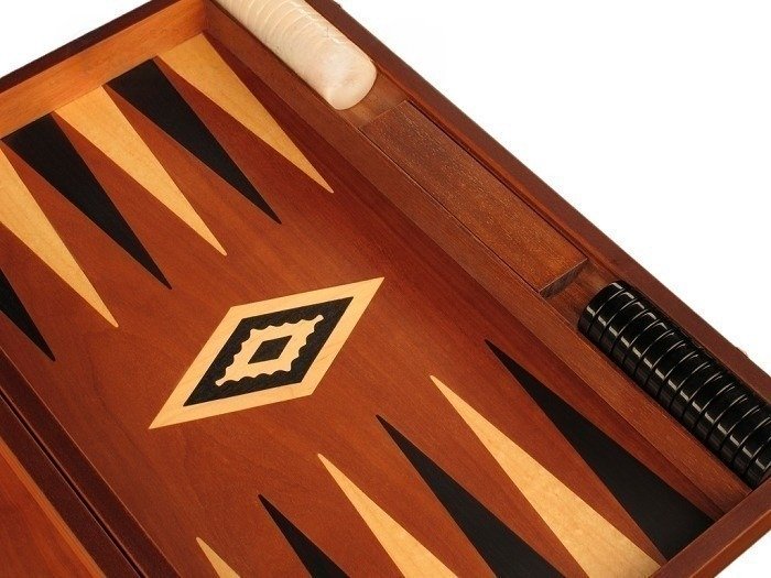 Presenting a magnificent mahogany backgammon set featuring a meticulously crafted mahogany playing surface, adorned with black poplar inlay for point 1 and oak for point 2. The case trim and checker trays are elegantly finished in solid mahogany.