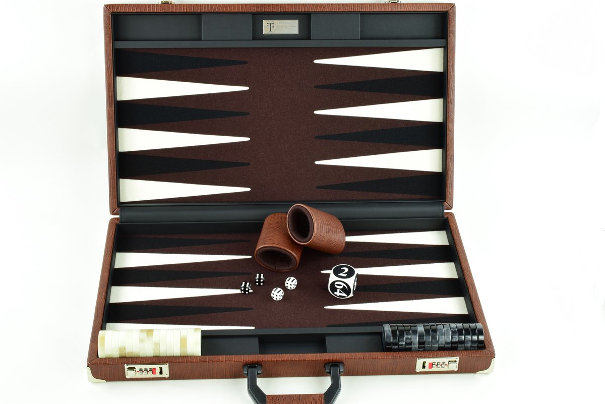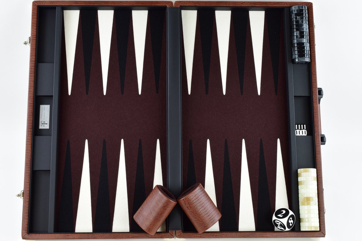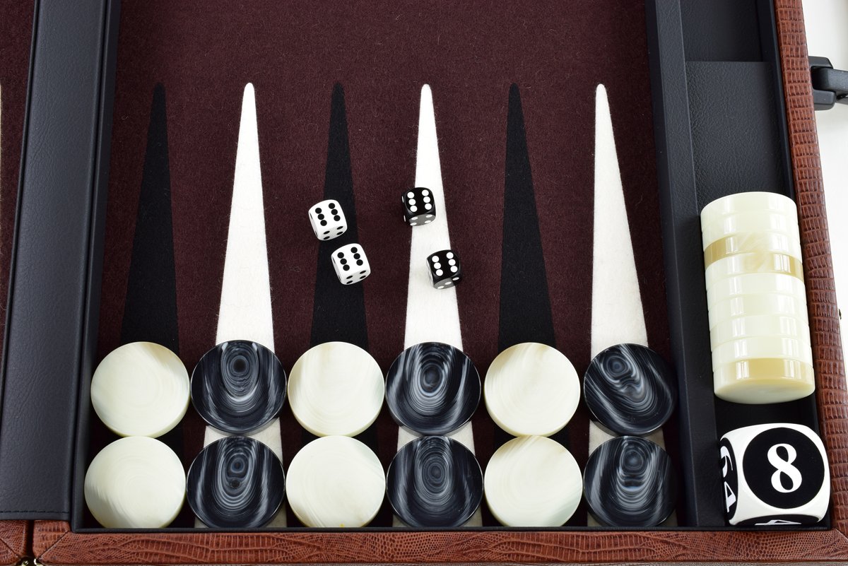 • “Mocha Alligator” – Special Edition Brown-Black-White FTH Tournament Size Backgammon Board. 45mm Checkers