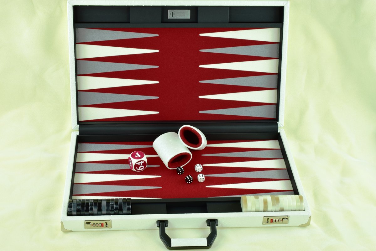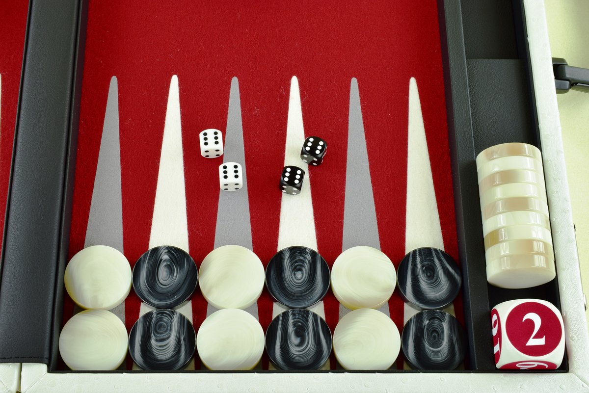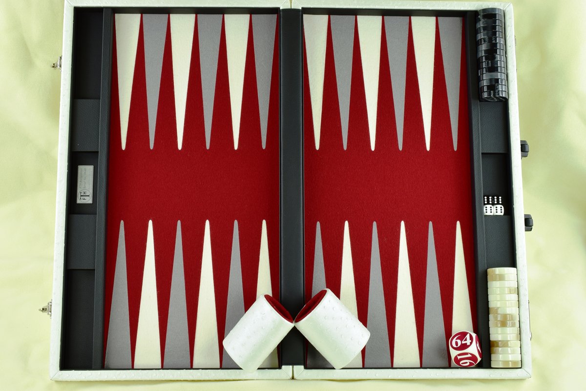 • “Mother of Pearl Ostrich” – Special Edition Red-Gray-White FTH Tournament Size Backgammon Board. 45mm Checkers