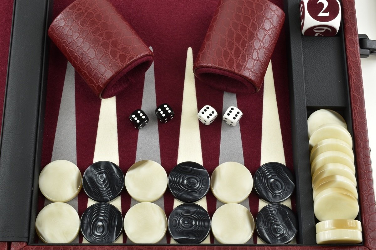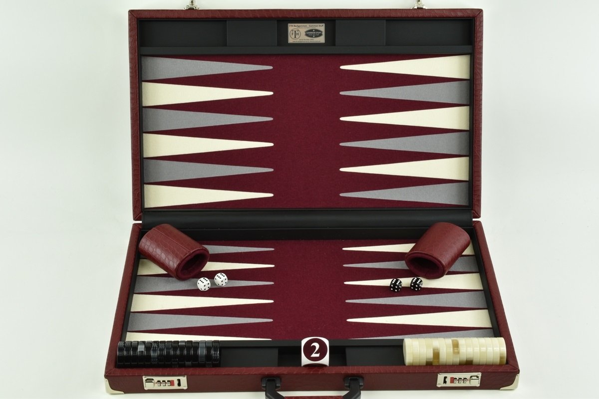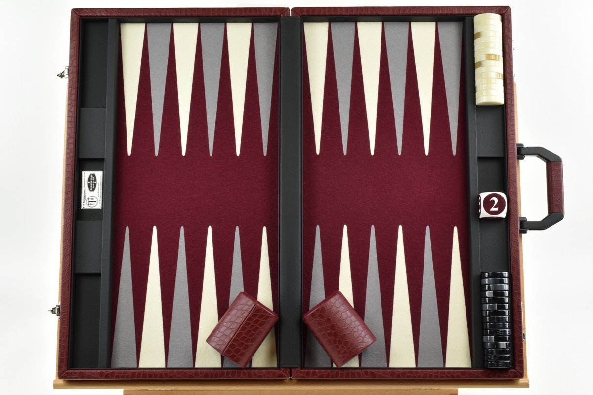 • Special Edition Bordeaux Gray White FTH Tournament Size Backgammon Set. 45mm Checkers