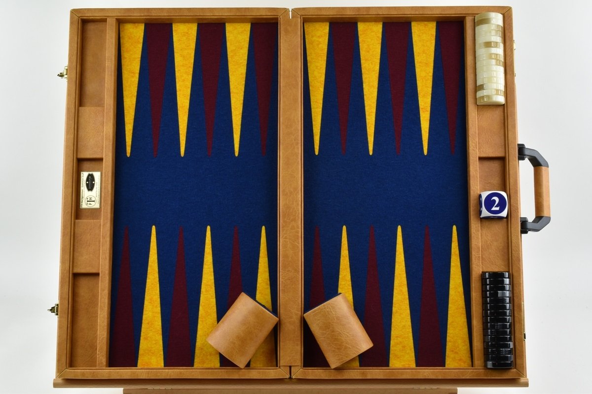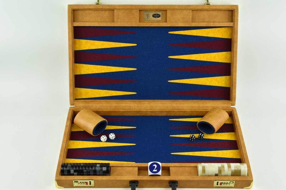 • Special Edition Pacific Blue-Saffron-Bordeaux FTH Tournament Size Backgammon Board. 45mm Checkers