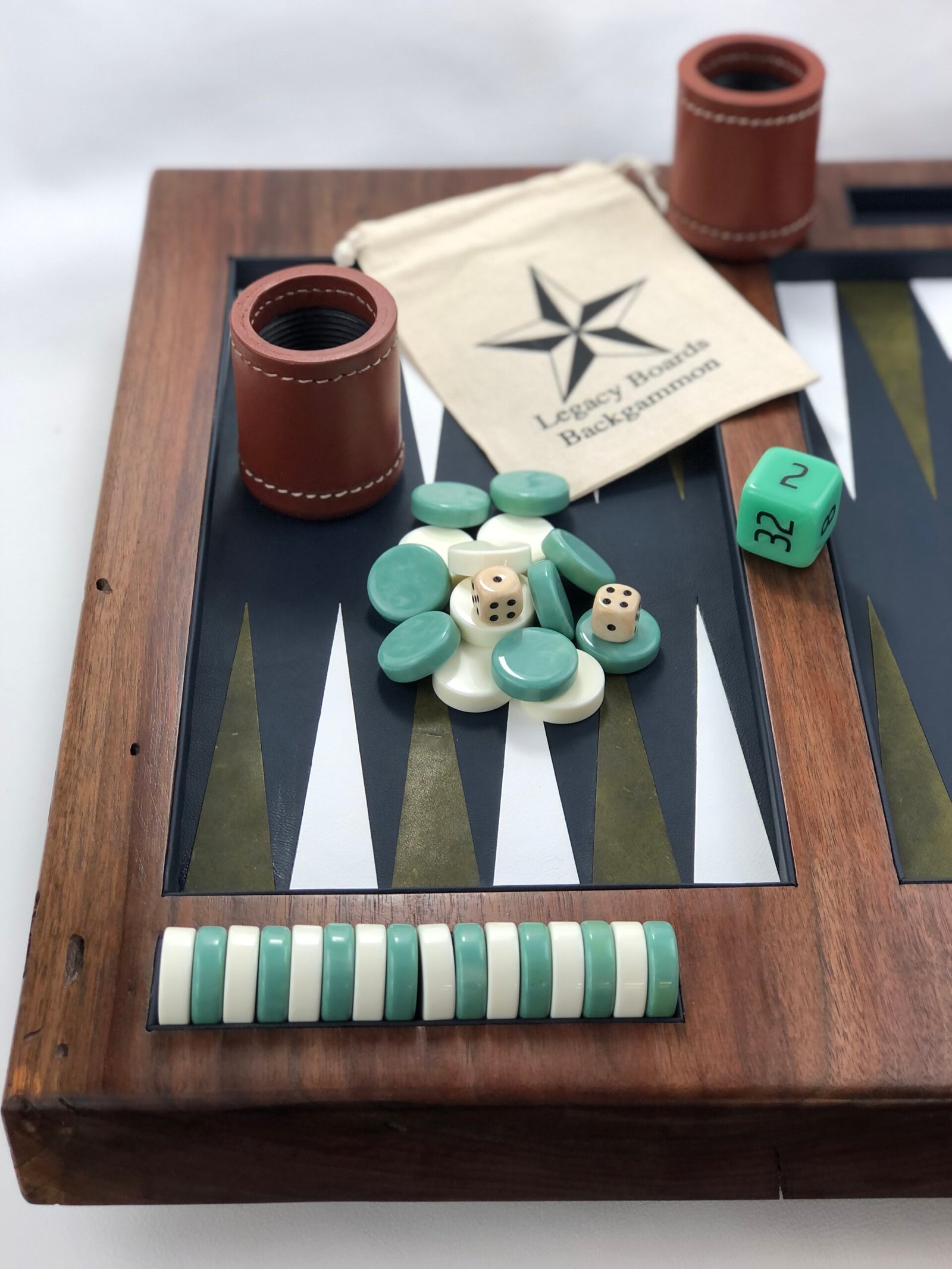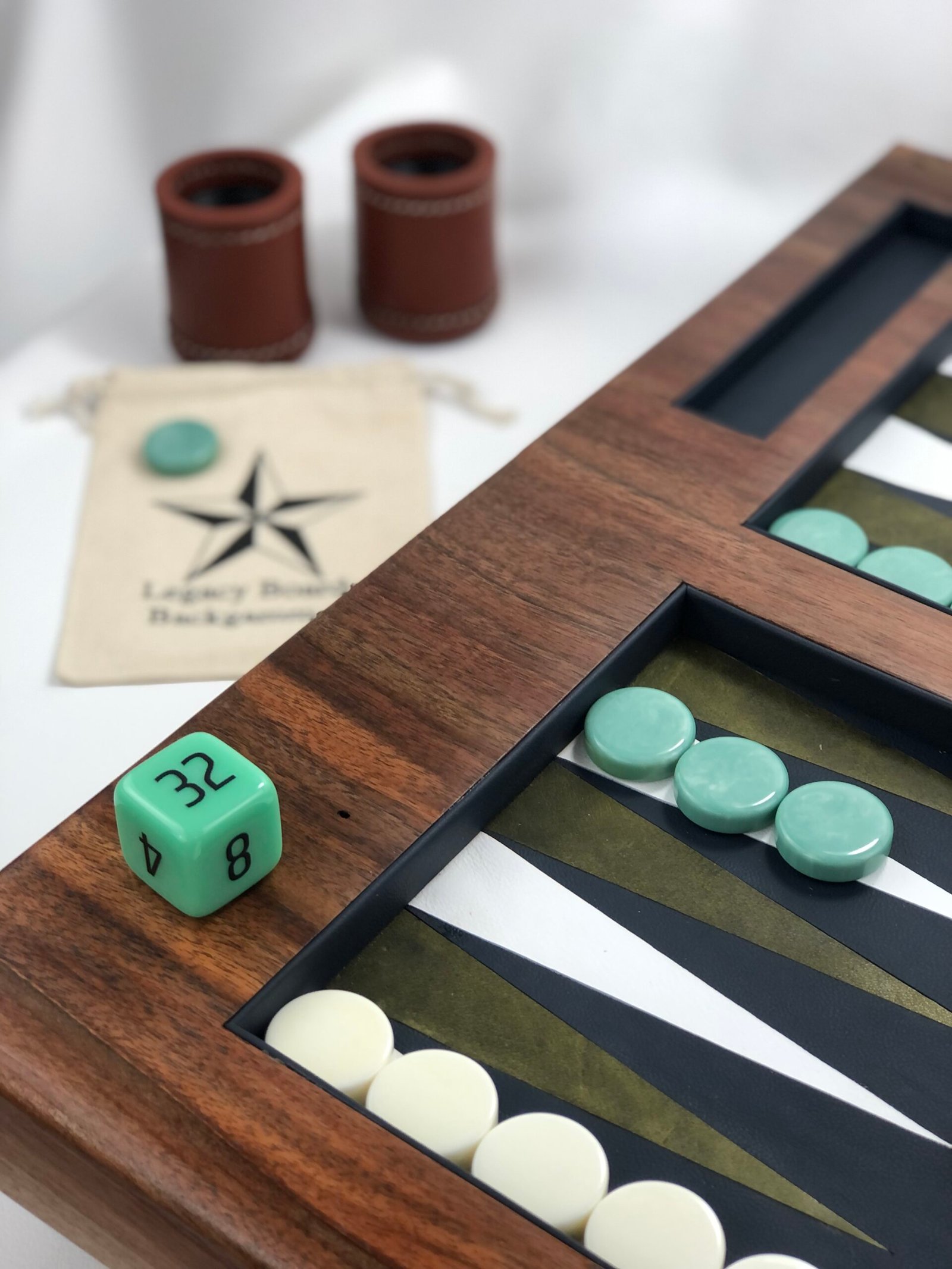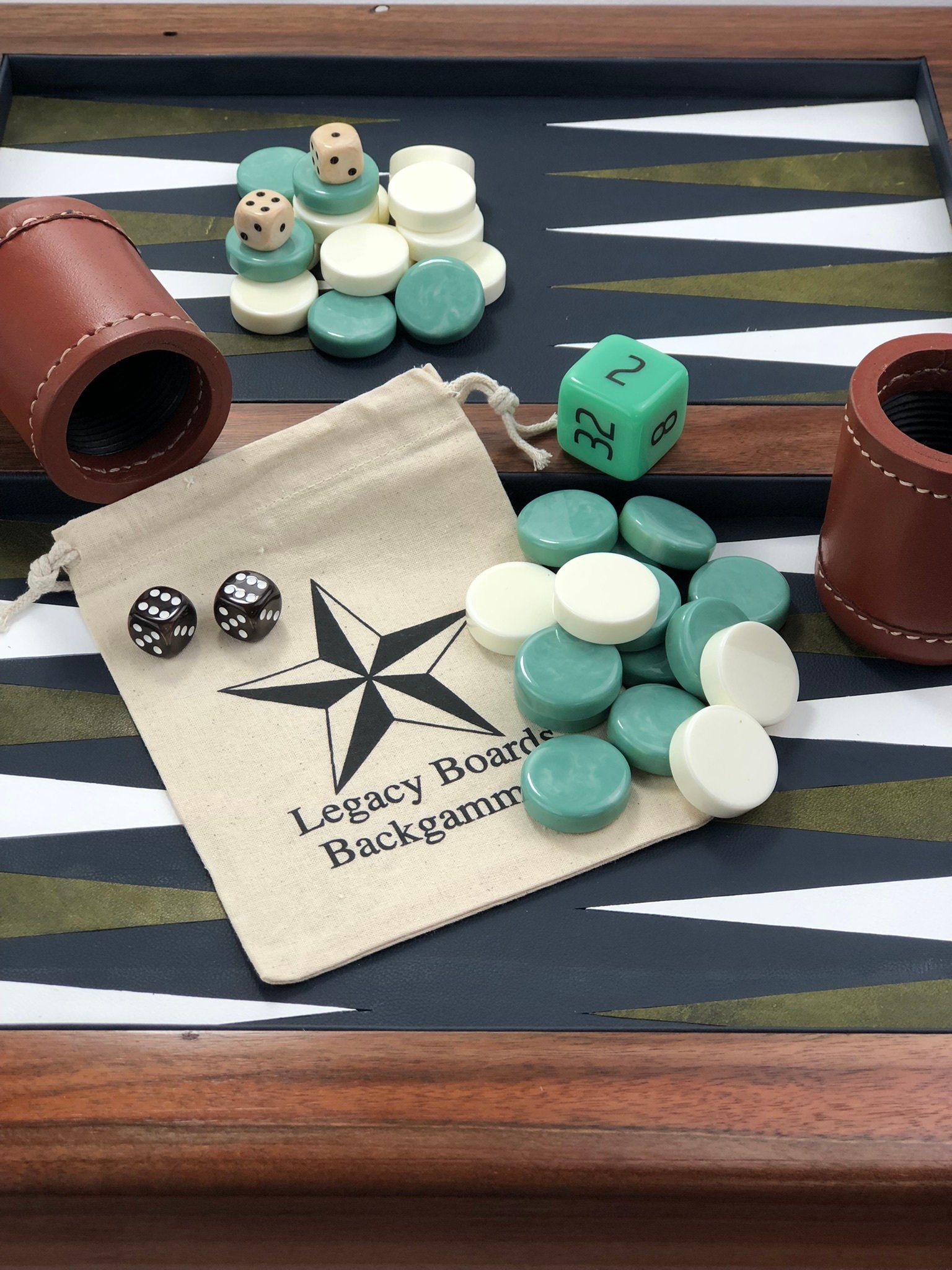 Checkers, dice, leather dice cups and doubling cubes pictured are included with all Legacy Boards orders,