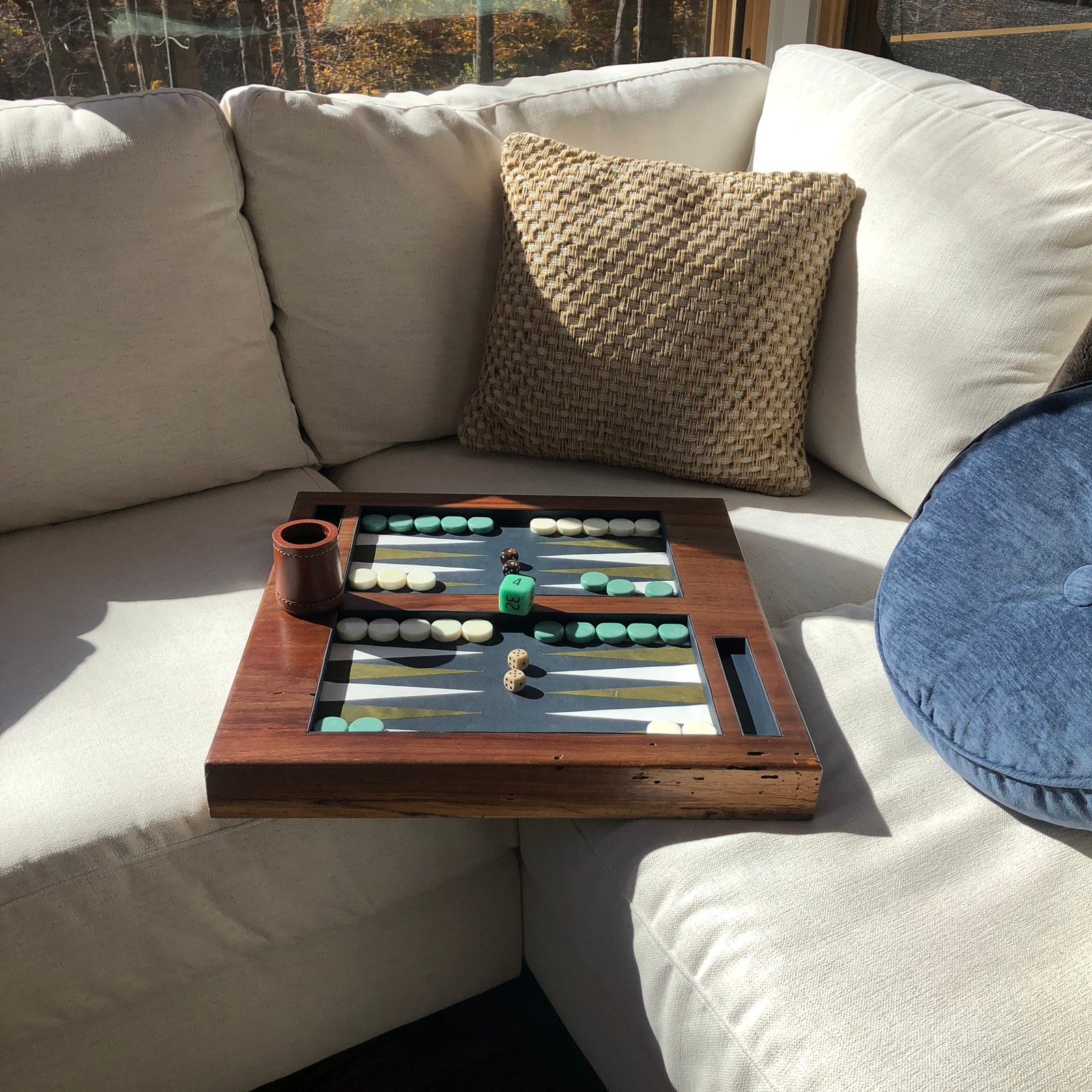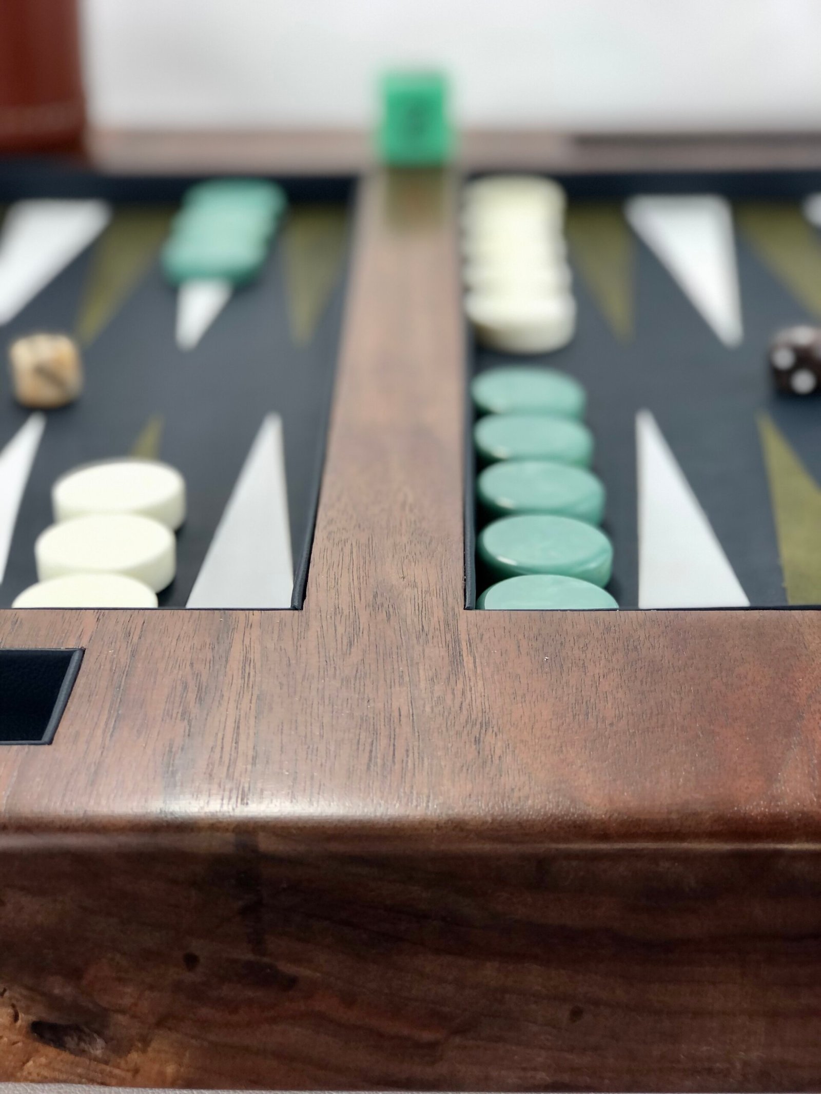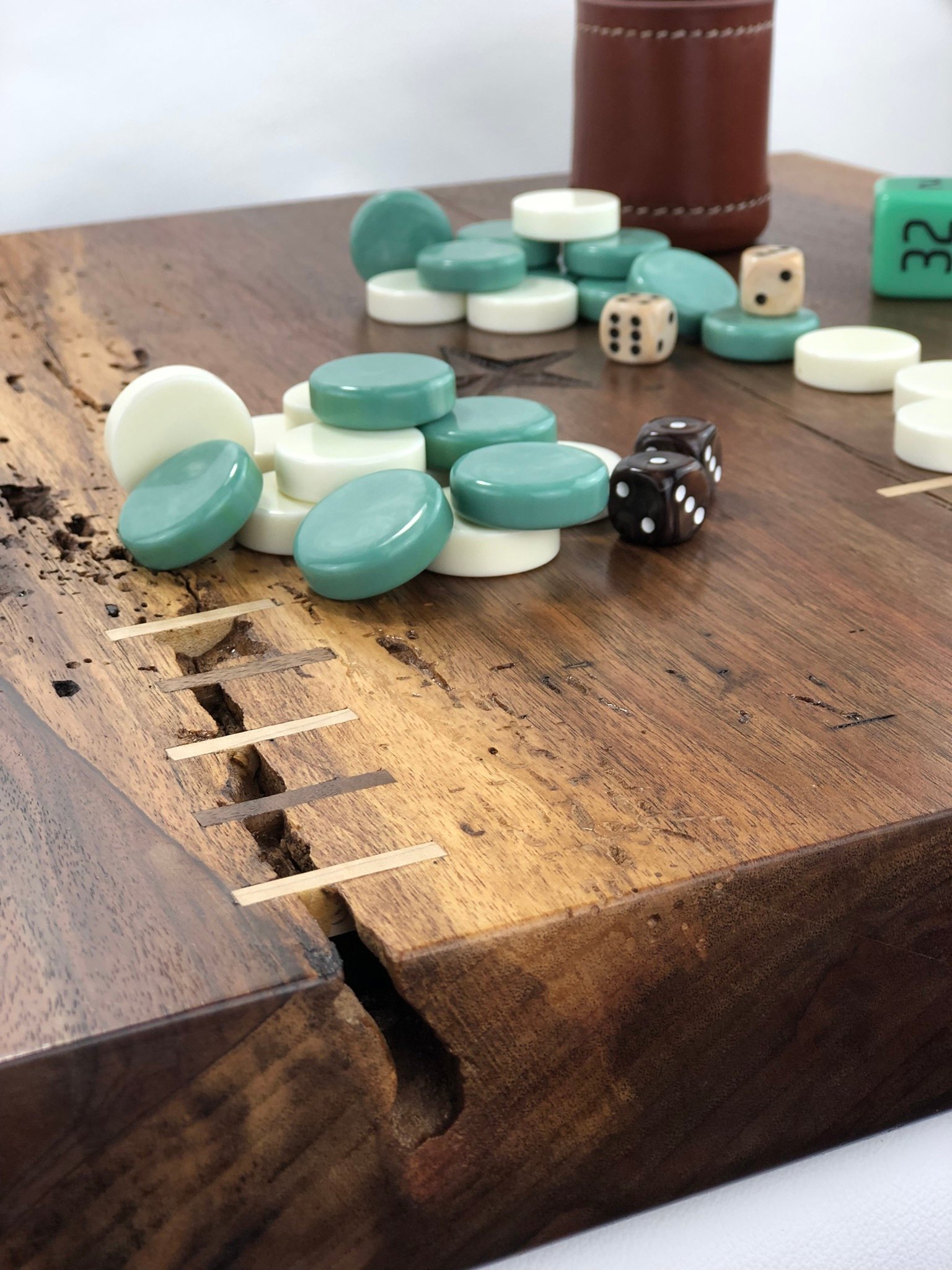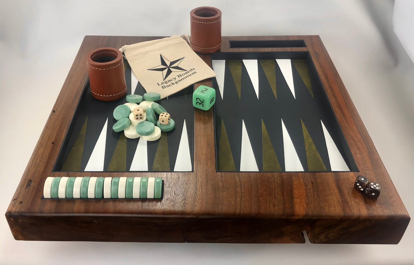 Checkers, dice, leather dice cups and doubling cubes pictured are included with all Legacy Boards orders,