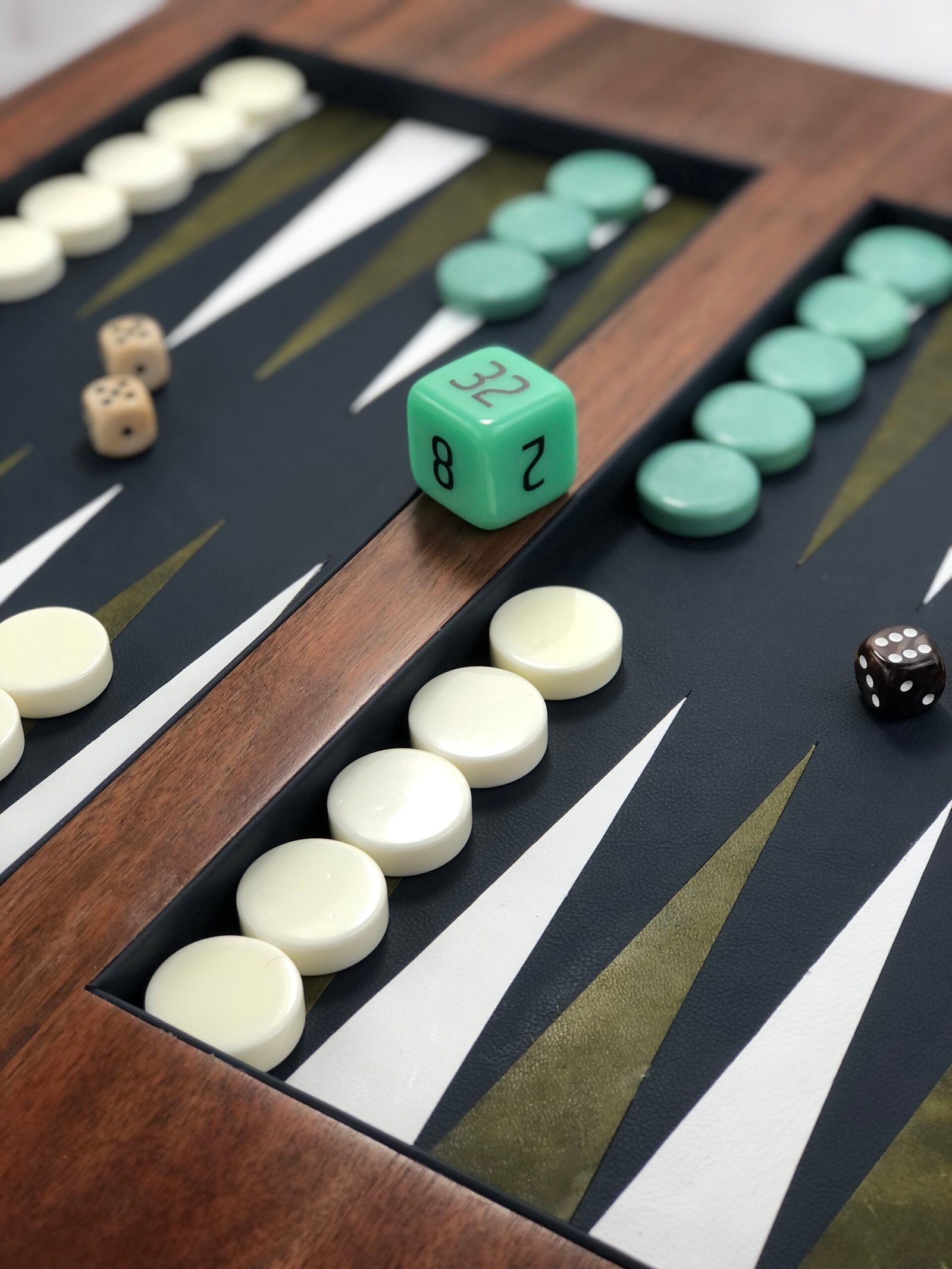Classic deep navy leather, olive and white points, combined with heather green checkers and doubling cube make this an easy complement to any décor.