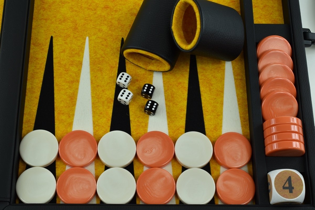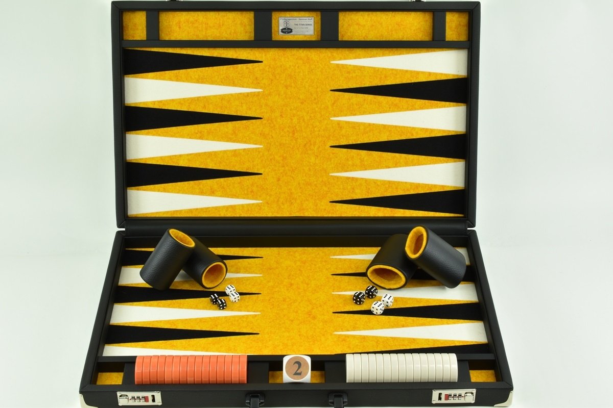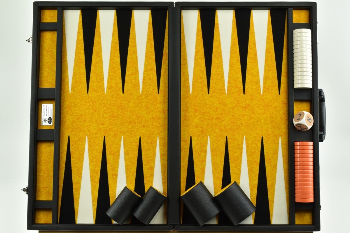 • Titan Series Flecked Saffron, Black – White Backgammon Set. 50mm (2″) Orange and White Checkers