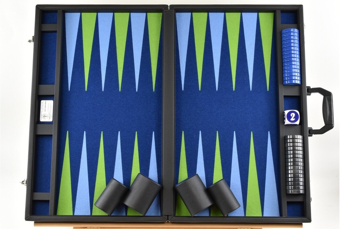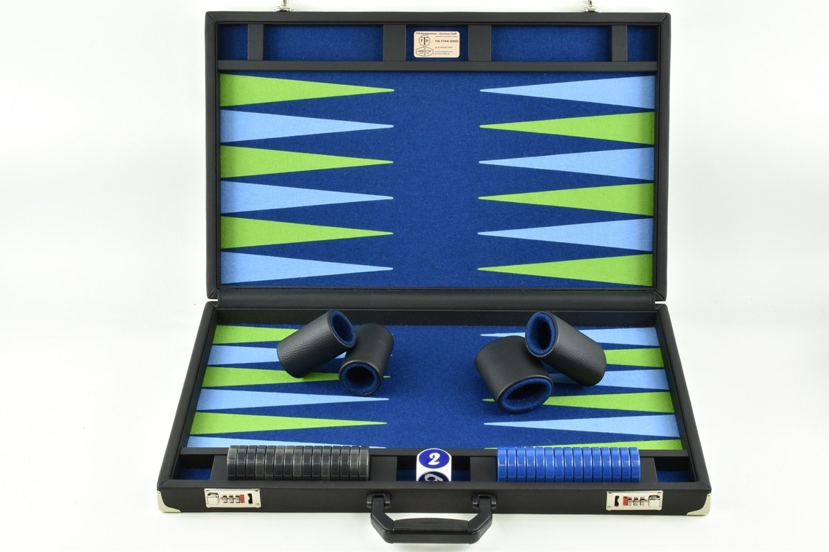 Crafted for discerning players, the Titan Series Backgammon Set boasts a captivating blend of Pacific Blue and Mai Green/Light Blue hues. The oversized 50mm (2 inch) Checkers in Gray and Blue are not only visually striking but also engineered for precise and satisfying gameplay. With 8 Precision Dice included, each roll adds an extra layer of excitement and unpredictability to your games. Whether you’re a seasoned player or new to the game, this set promises hours of enjoyment, complemented by the convenience of the heavy-duty carry bag for easy transportation and storage. Experience the epitome of luxury gaming with the Titan Series, where quality craftsmanship meets unparalleled elegance.
