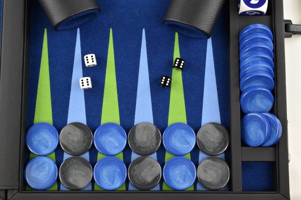 • Titan Series Pacific Blue – Mai Green/Light Blue Backgammon Set. 50mm (2 inch) Gray & Blue Checkers