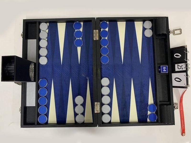 Step into the world of competitive backgammon with the Tournament Size Blue Carbon Fiber Look Backgammon Board from ArtGammon.