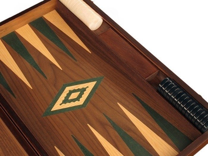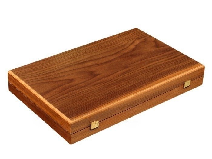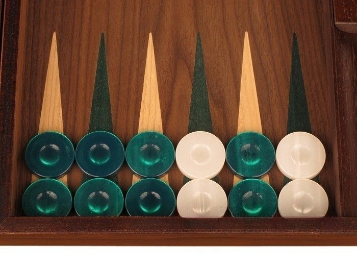 Introducing a stunning walnut backgammon set showcasing a meticulously crafted walnut playing field, adorned with blue poplar inlay for point 1 and oak for point 2. The case trim and checker trays are impeccably finished in solid walnut.