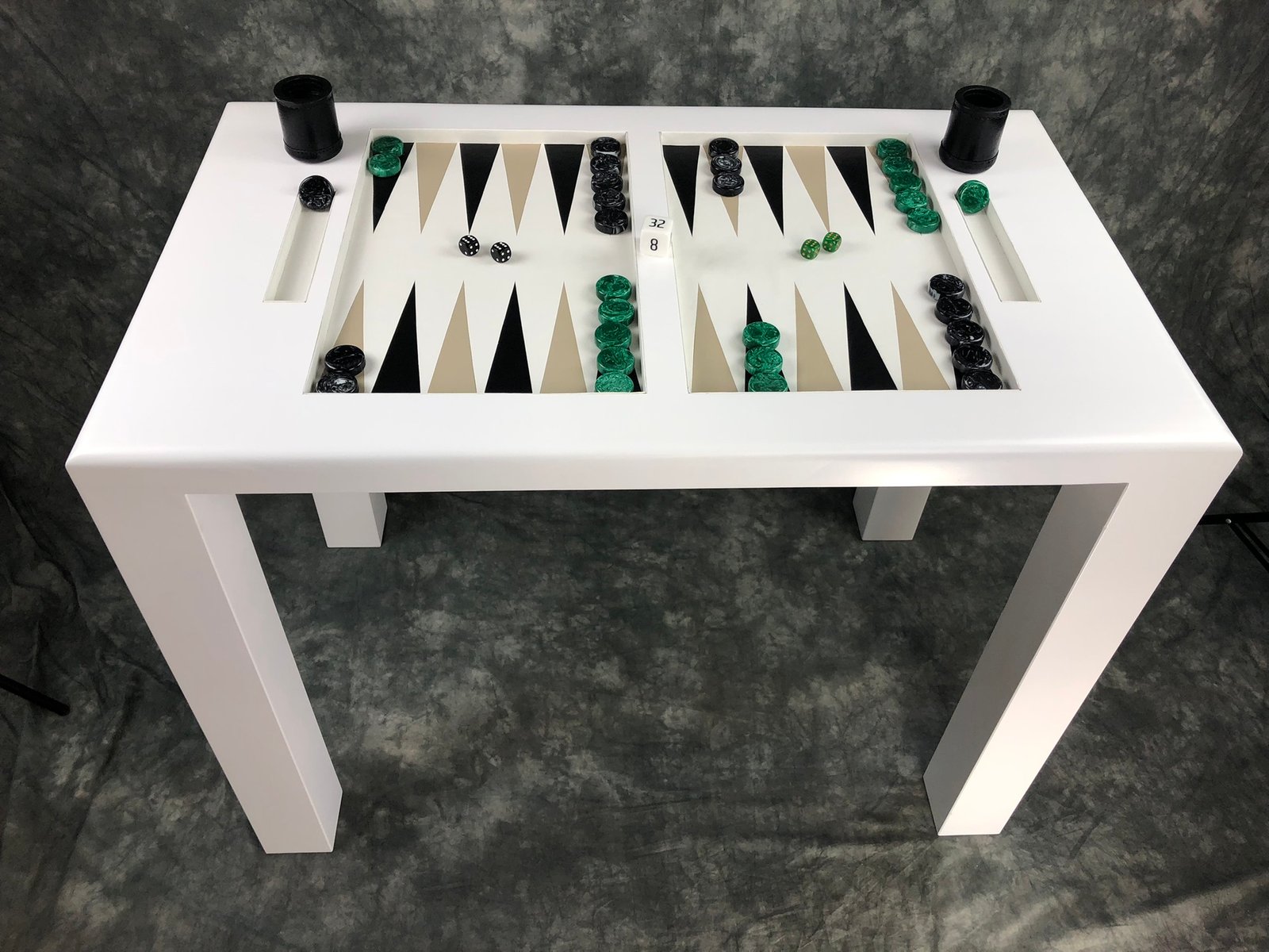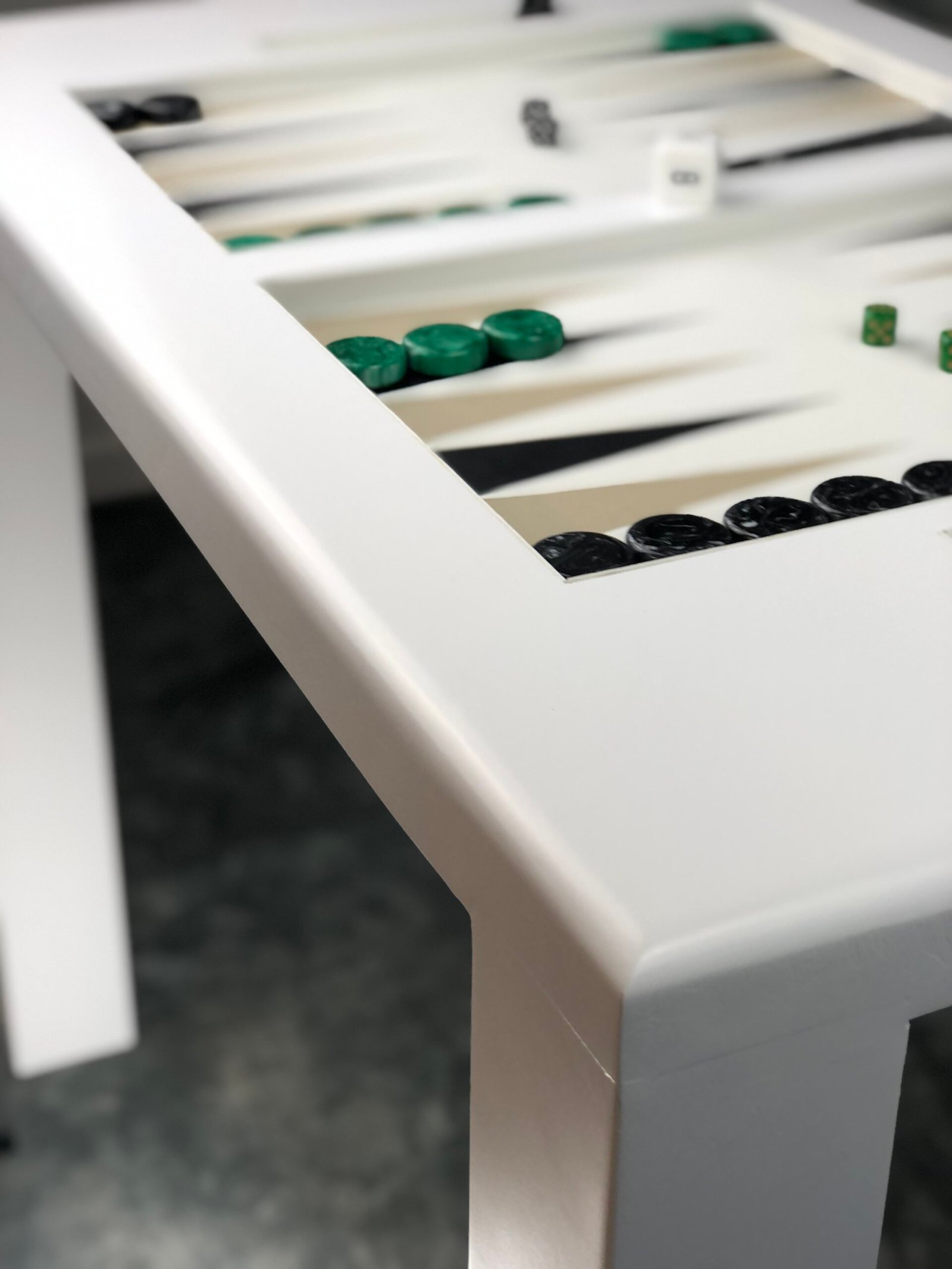 Classic/Contemporary white backgammon table. Soft edges seamlessly transition into its bold square legs setting the stage for jewel-toned playing pieces that add brilliant sparkle to the elegant playing surface. Designed by Legacy Boards.