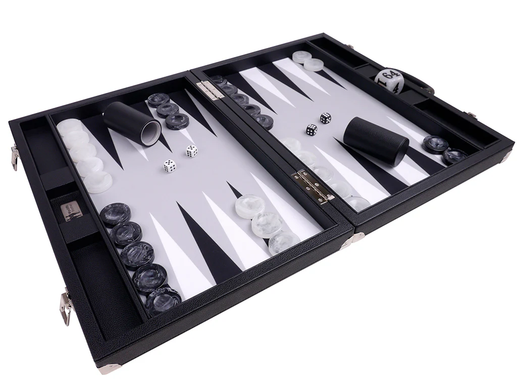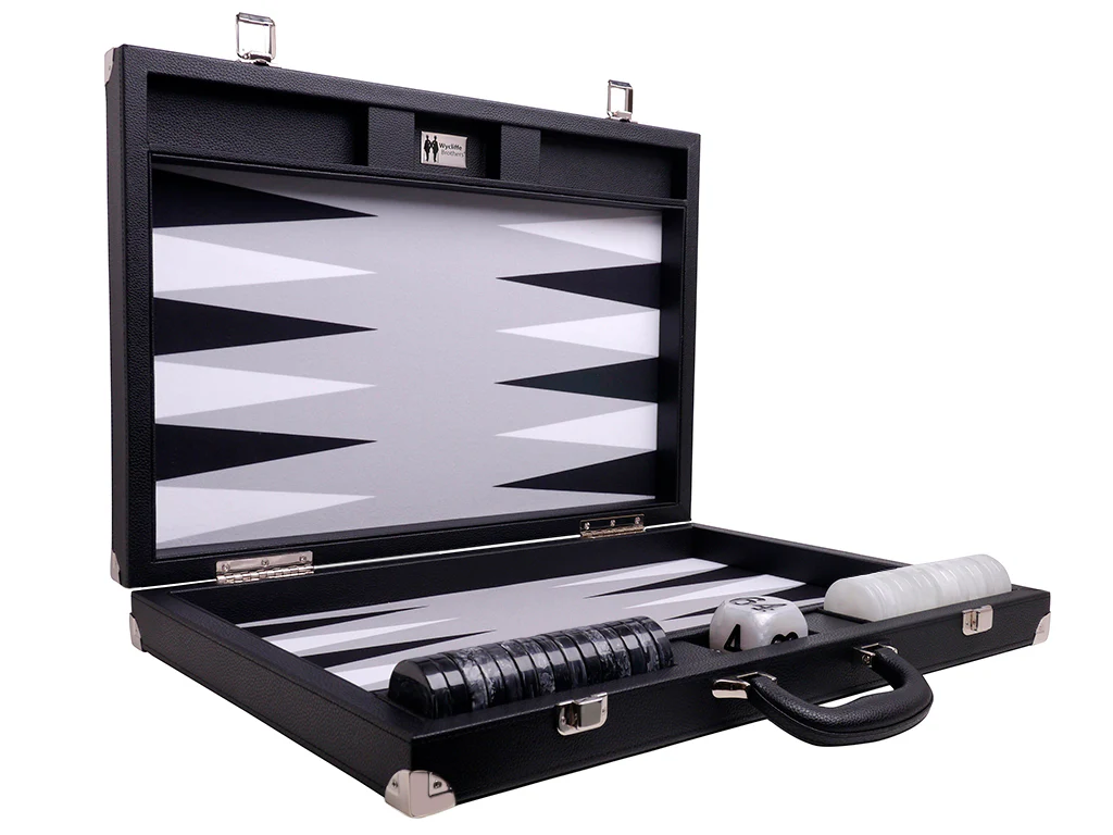 Wycliffe Brothers® 21-inch Tournament Backgammon Set – Black Case with Grey Field – Masters Edition