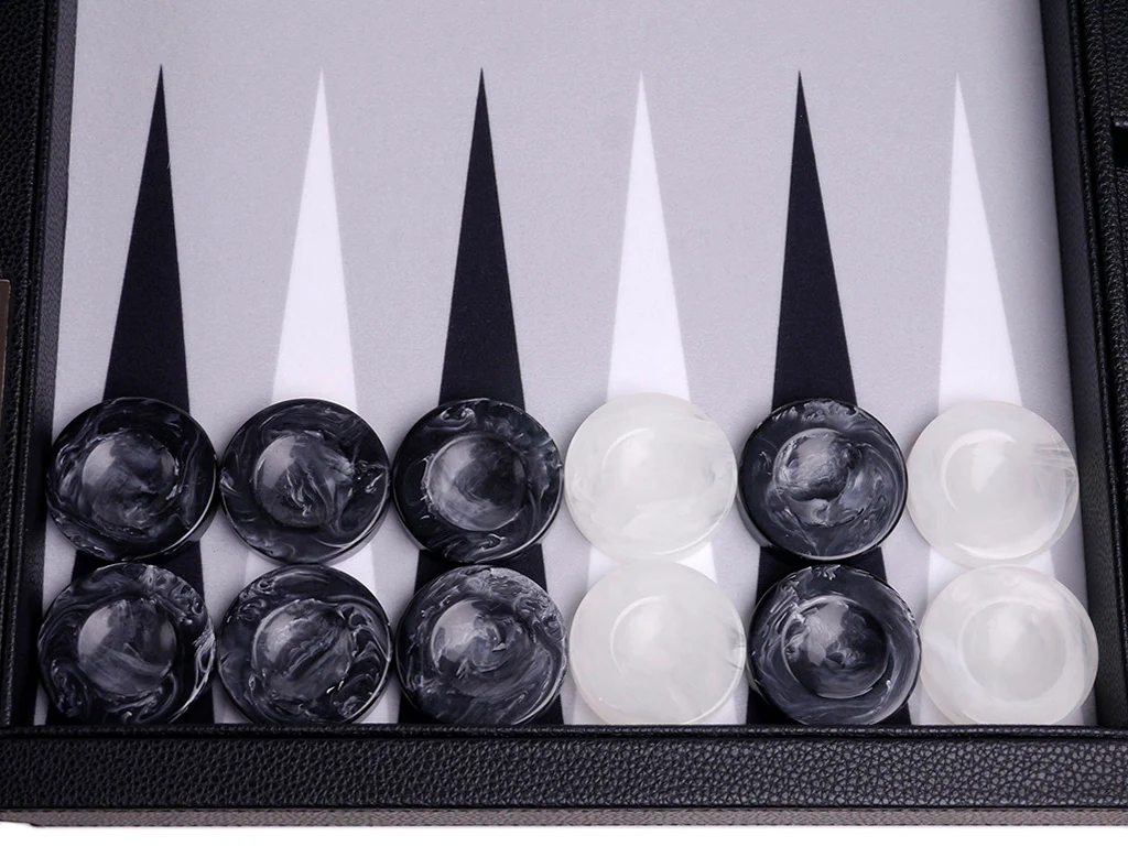 You will appreciate handling the phenomenal marbleized checkers, so highly polished you’ll find yourself transfixed by their beauty. Just shy of 1/2″ thickness (11mm), these oversized checkers significantly reduce the instances of cocked dice, so you spend more time on game play rather than re-rolling your dice. If you’re looking for heavy checkers, you’ve found them. Weighing in at a whopping 20 grams each, it’s official – these are the new King of backgammon checkers!