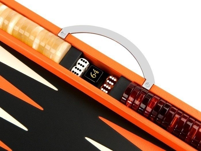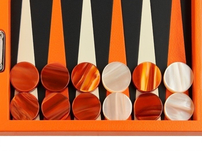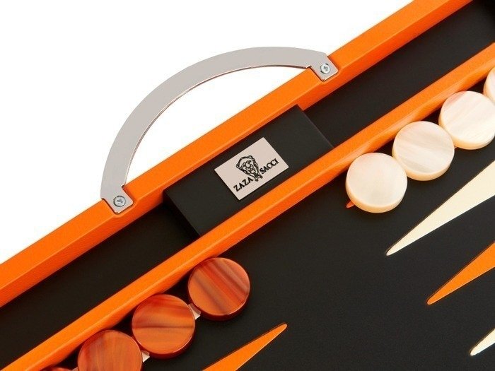 This beautiful orange leather travel sized backgammon board is the ideal personification of high-class artistry you can expect in every Zaza & Sacci product. Refined with top quality leather and with pristine adornments on the playing surface, this backgammon board is destined to stay in the family for centuries.